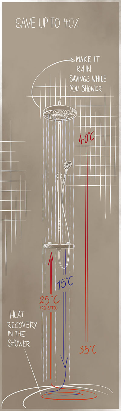 Hansgrohe befindet sich darüber hinaus in der Entwicklung für innovative und anwenderfreundliche Lösungen für die Wärmerückgewinnung beim Duschen. Dabei geht es sowohl um einfach nachrüstbare Systeme als auch um eine Technologie für die Sanierung und den Neubau von Duschen und Bädern. Das Funktionsprinzip basiert dabei auf dem eines Wärmetauschers: Das abfließende warme Duschwasser wird dazu genutzt, weiteres Kaltwasser zum Duschen zu erwärmen.