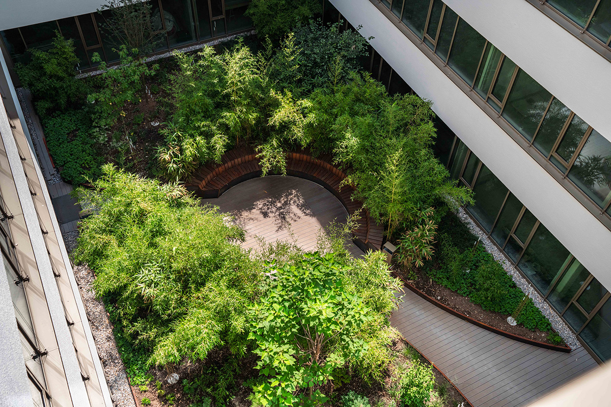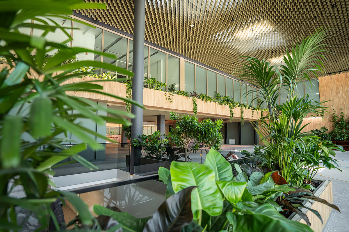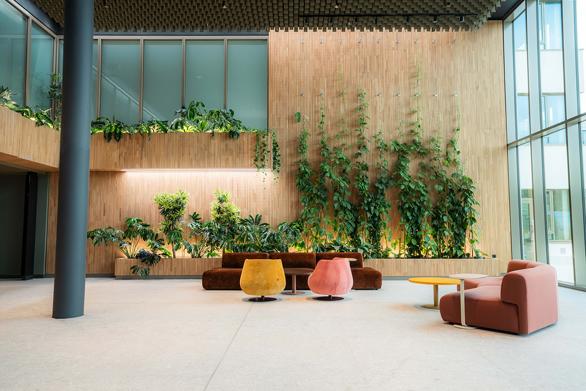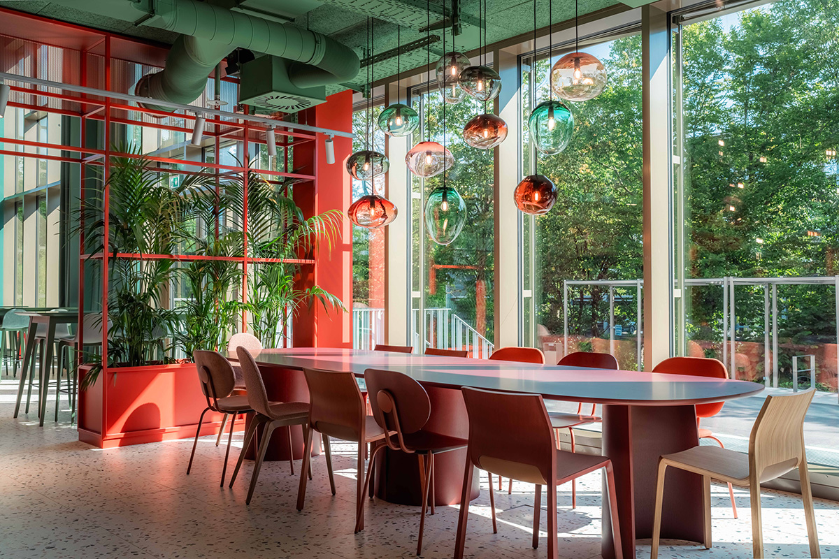 Was die internationale Expertenjury aus 131 Designprofis überzeugt hat? Zum einen das ganzheitliche Gesundheitskonzept von Deutschlands erstem Immune Office, das mit optimaler Luftqualität, biorhythmischem Lichtdesign und 1.200 Pflanzen in den begrünten Atrien den Menschen in den Mittelpunt stellt. Vor allem haben aber die innenarchitektonische Gestaltung mit hochwertigen, natürlichen Materialien durch Ippolito Fleitz Identity Architects und das hauseigene Restaurant "Hungry Heads“ mit 300 Sitzplätzen für Bestnoten gesorgt, das dank Svenja Hansen – Bargtied Design – zu einem optischen Leckerbissen geworden ist.