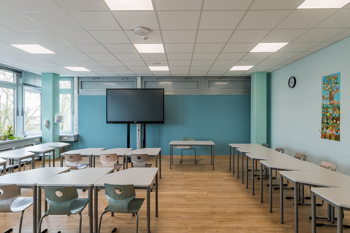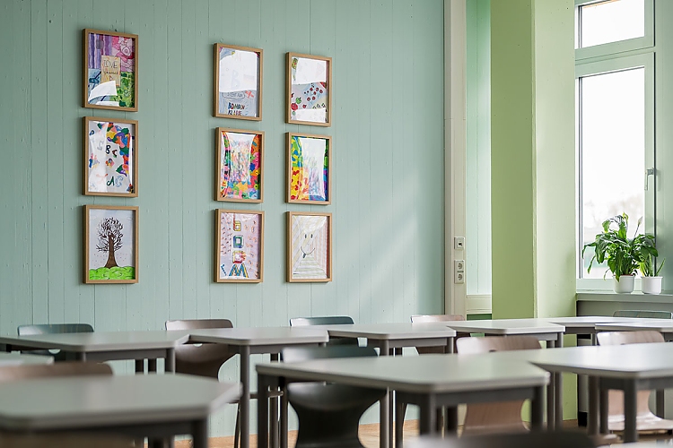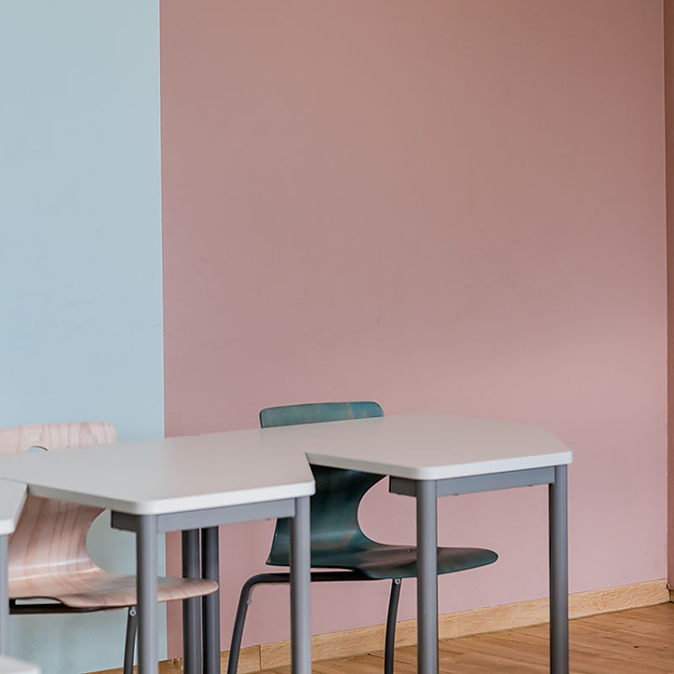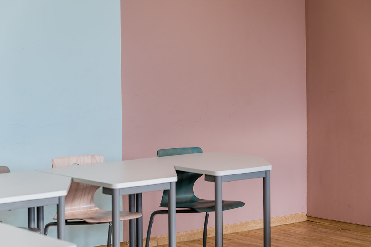 Die gewählten Farben entsprechen den Bedürfnissen der Nutzerinnen und Nutzer und dem Nutzen der Räume. Sie begründen sich einerseits auf die Farbvorlieben der Schülerinnen und Schüler. Diese liegen im Blau, Grünblau und Pastellbereich, mit insgesamt einer klaren, ruhigen, eher kühlen Anmutung. Der gemeinsame "Farbnenner“ Blau und Grünblau wird auch den Lehrerinnen und Lehrern gerecht. Zum anderen drücken die gewählten Farben und ihre Verteilung im Raum auch aus, welche Beschreibungen die jungen Menschen zur Raumatmosphäre gewählt haben. Wie sauber, strukturiert, leicht, frisch, fokussiert etc.