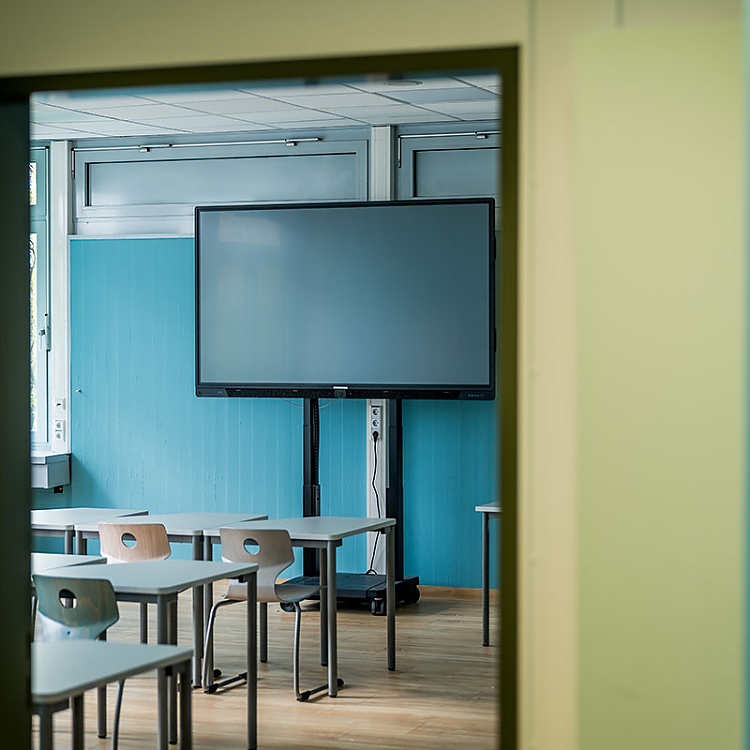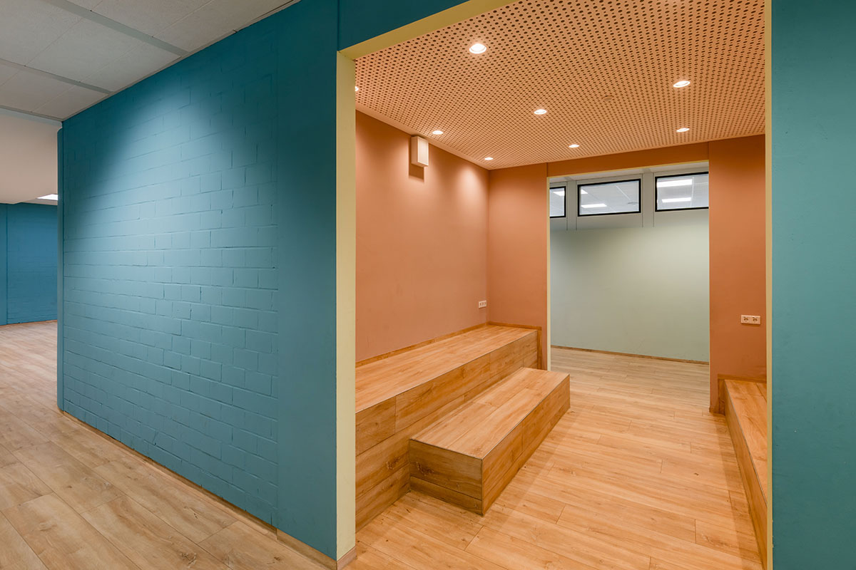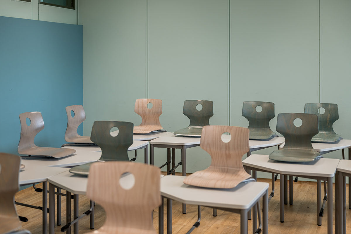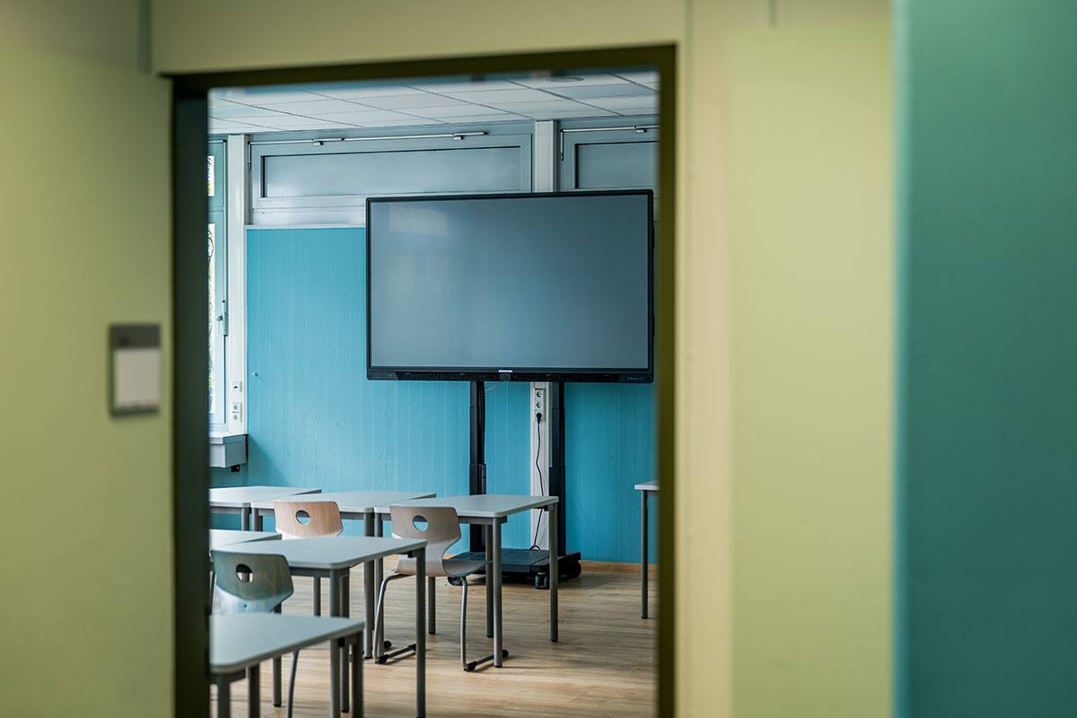 Die gewählten Farben entsprechen den Bedürfnissen der Nutzerinnen und Nutzer und dem Nutzen der Räume. Sie begründen sich einerseits auf die Farbvorlieben der Schülerinnen und Schüler. Diese liegen im Blau, Grünblau und Pastellbereich, mit insgesamt einer klaren, ruhigen, eher kühlen Anmutung. Der gemeinsame "Farbnenner“ Blau und Grünblau wird auch den Lehrerinnen und Lehrern gerecht. Zum anderen drücken die gewählten Farben und ihre Verteilung im Raum auch aus, welche Beschreibungen die jungen Menschen zur Raumatmosphäre gewählt haben. Wie sauber, strukturiert, leicht, frisch, fokussiert etc.
