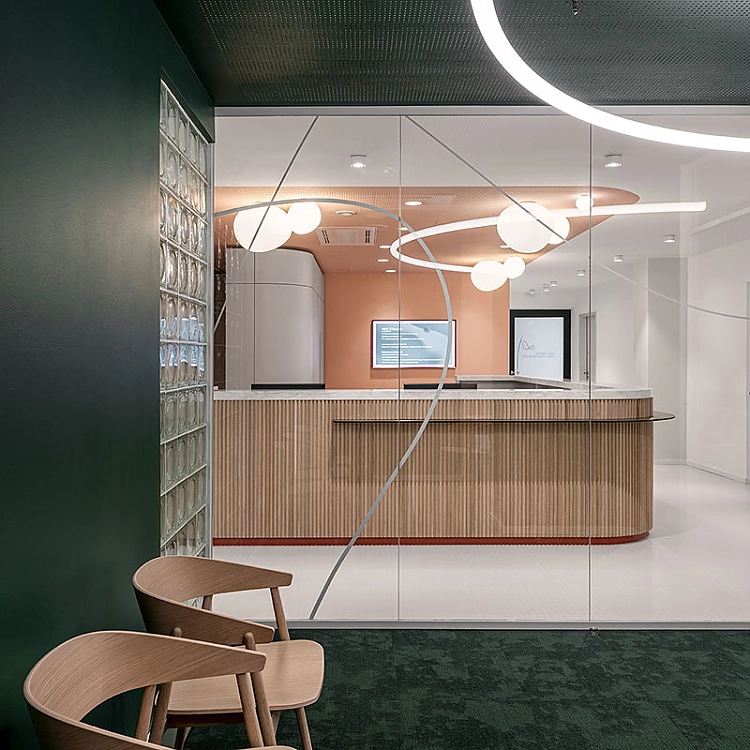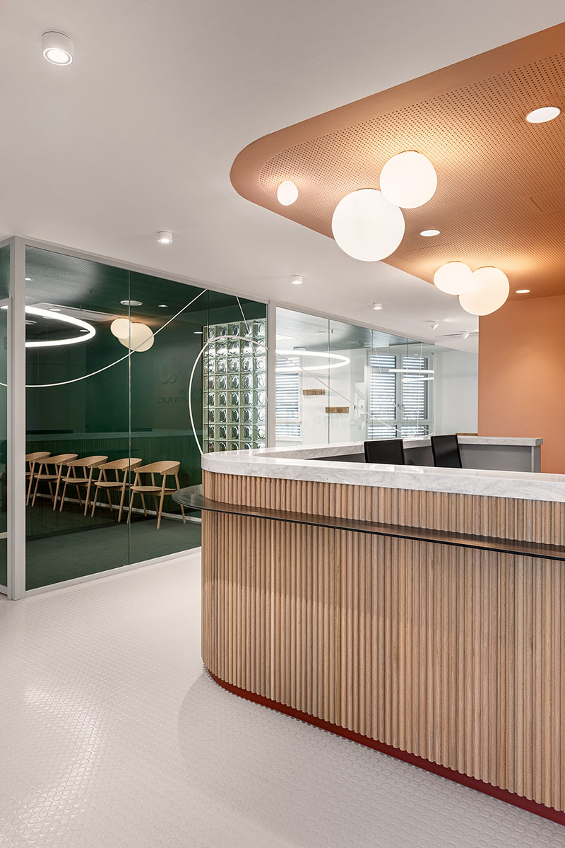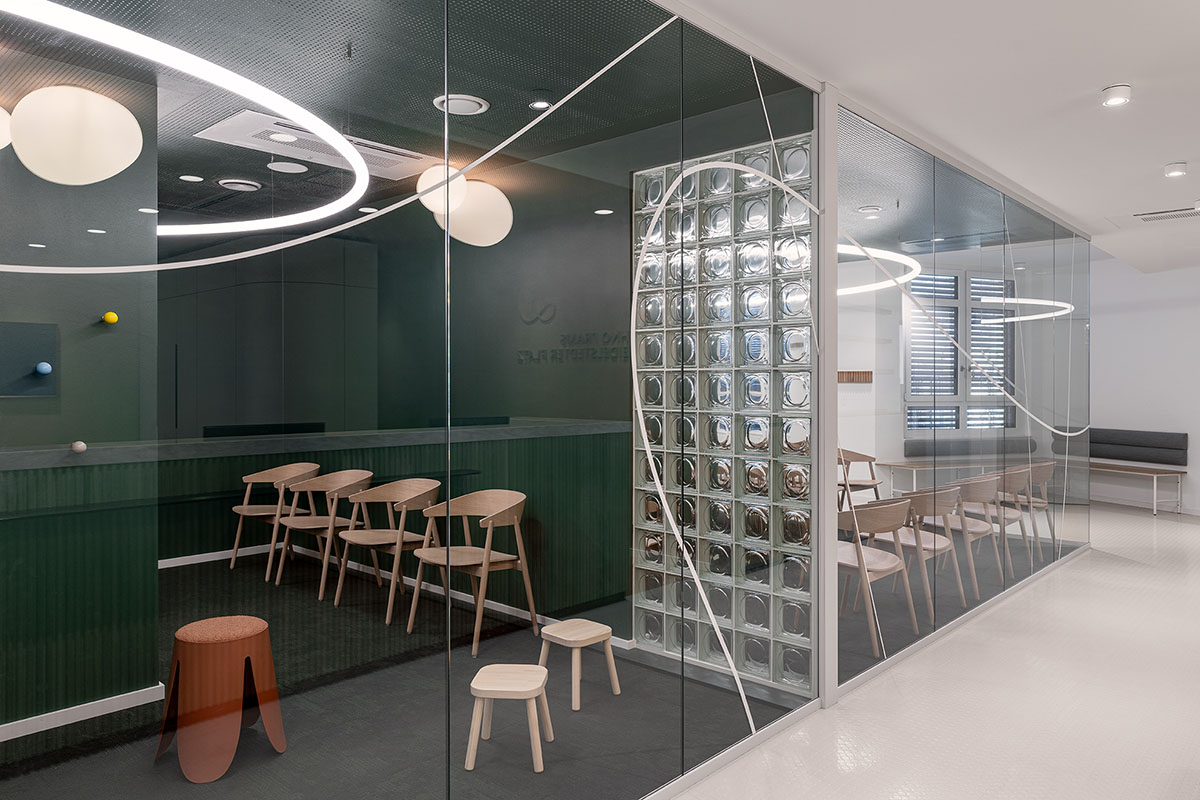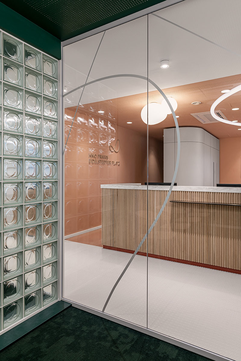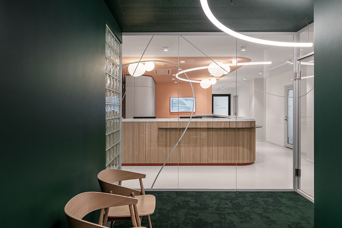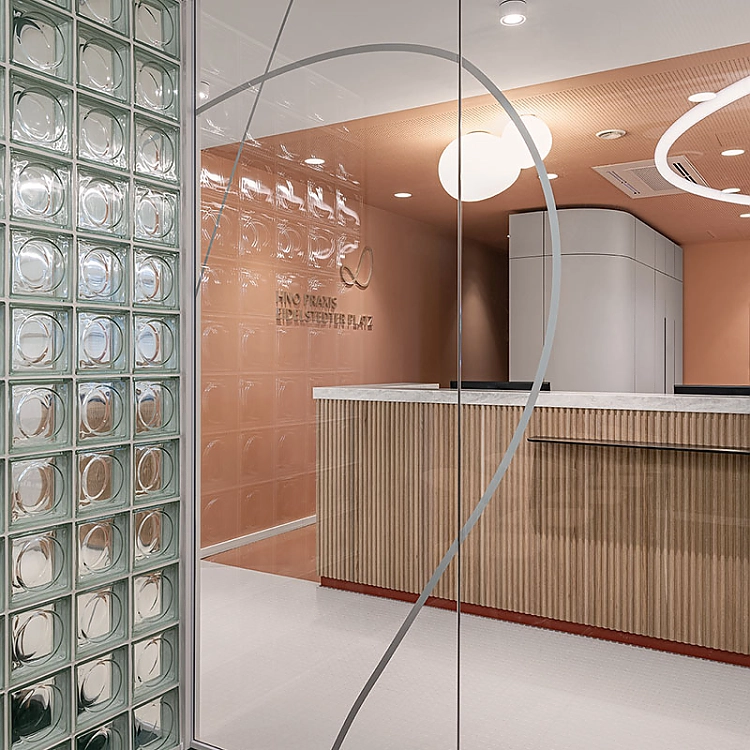 In Anlehnung an den Fachbereich der Praxis und im Einklang mit deren Markenauftritt zieht sich eine runde Formgebung als gestalterisches Leitmotiv durch die gesamte Praxis. Diese findet sich in verschiedenen Details wieder. Das gesamte Design folgt einer eleganten und zurückgenommenen Ästhetik. Das Wegeleitsystem nimmt sich dieser an und vermittelt über ihre klaren Strukturen Ruhe in hektischen Praxisalltag. Behandlungsräume sind klar nummeriert, während die Folierungen und grafischen Elemente die gestalterische Linie der Bildmarke aufnehmen und so ein stimmiges Gesamtbild schaffen. Das Ergebnis sind Räume mit Tiefe und wertigen Materialien, die den Patienten durch die nutzungsorientierte und ergonomische Gestaltung ansprechen und den Menschen dabei in den Mittelpunkt stellen.