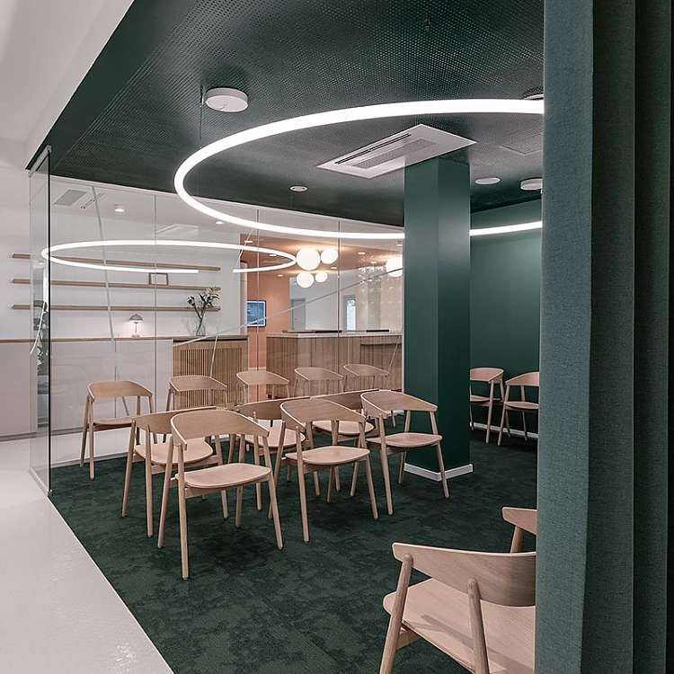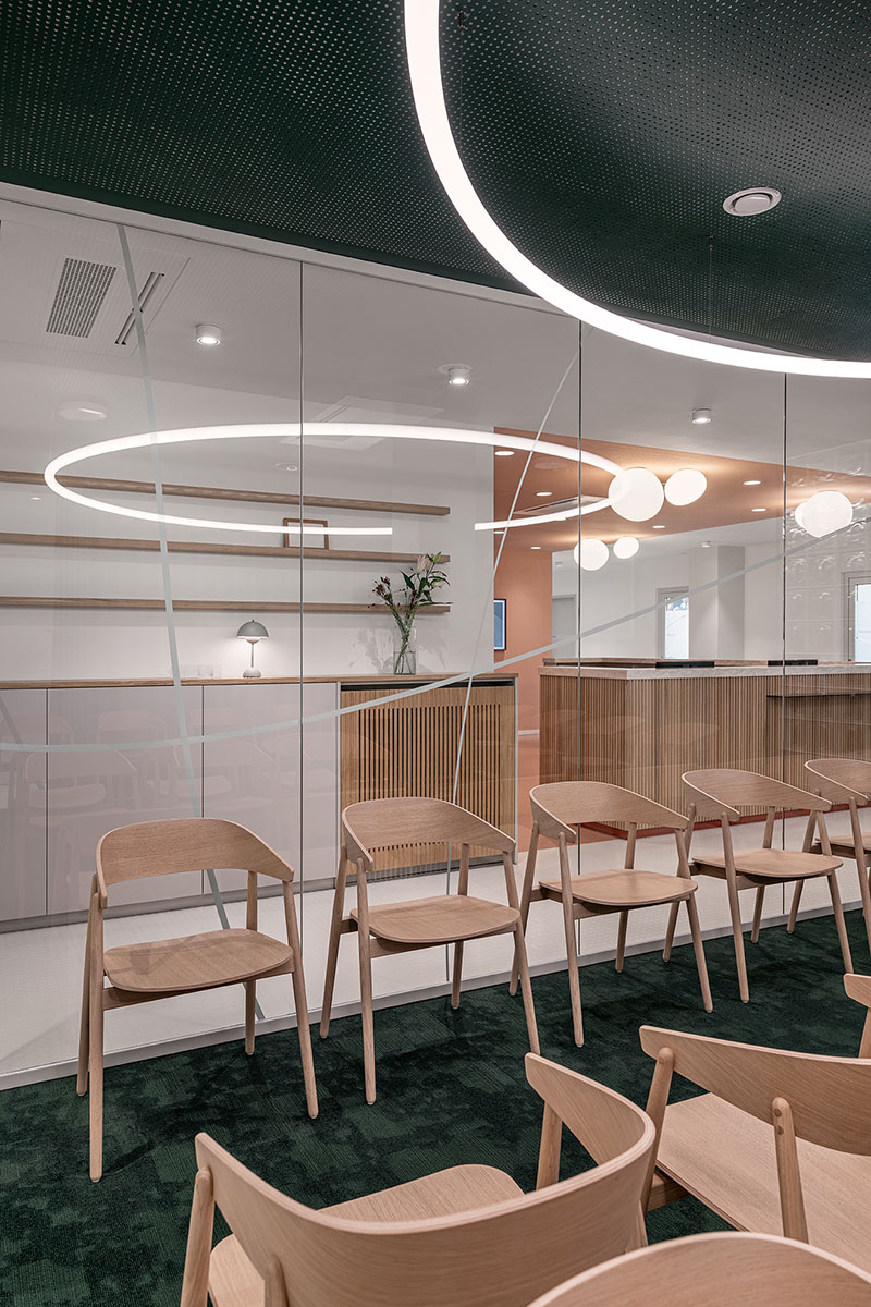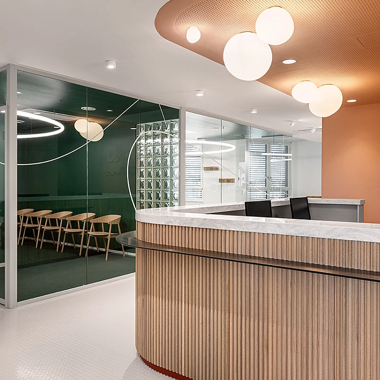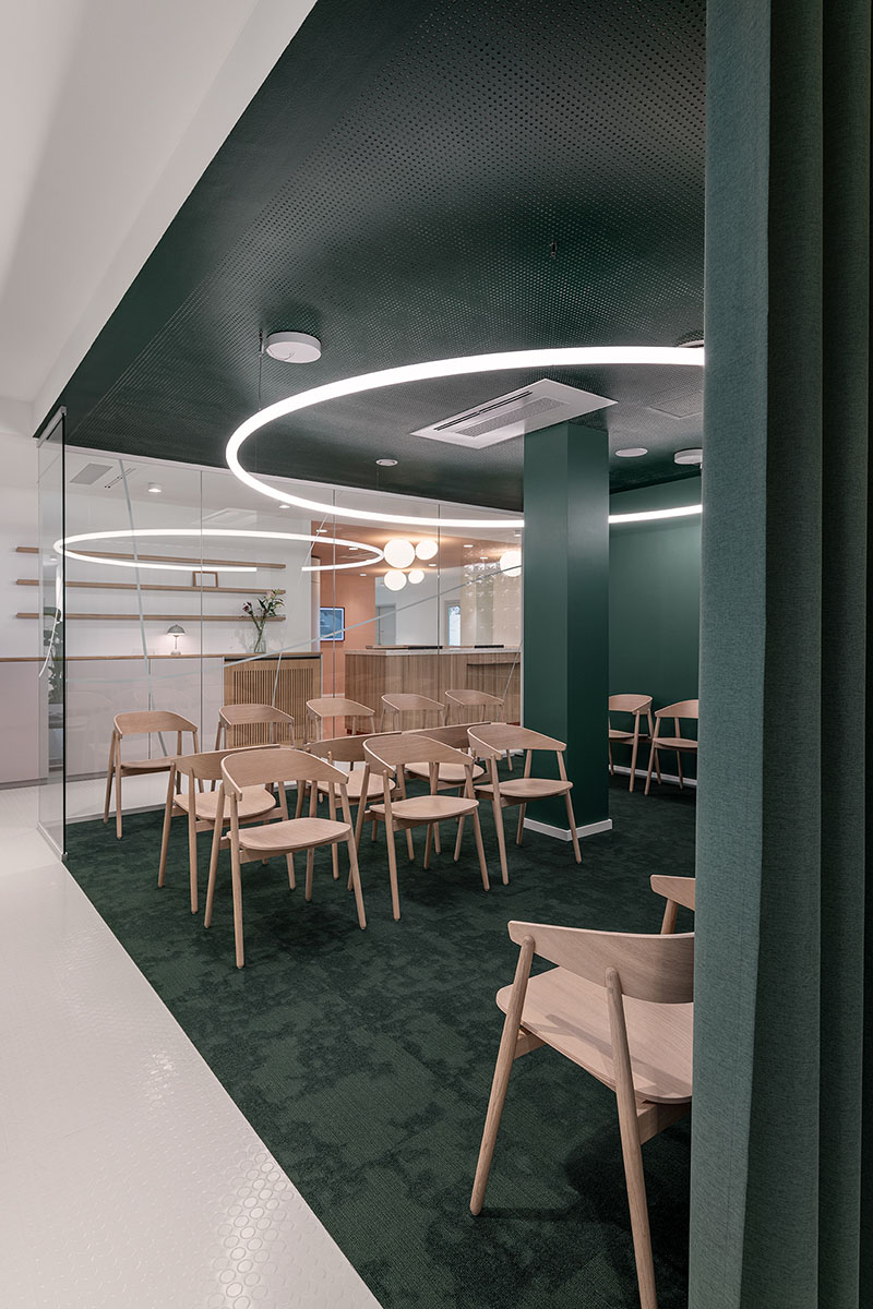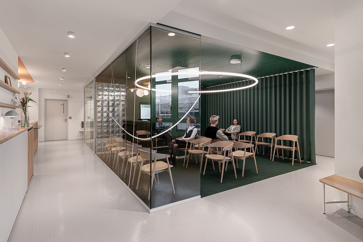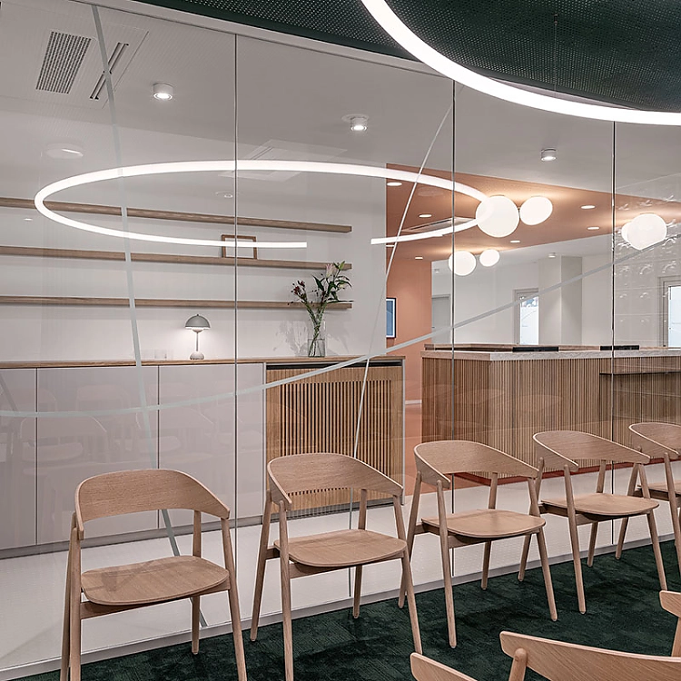 In Anlehnung an den Fachbereich der Praxis und im Einklang mit deren Markenauftritt zieht sich eine runde Formgebung als gestalterisches Leitmotiv durch die gesamte Praxis. Diese findet sich in verschiedenen Details wieder. Das gesamte Design folgt einer eleganten und zurückgenommenen Ästhetik. Das Wegeleitsystem nimmt sich dieser an und vermittelt über ihre klaren Strukturen Ruhe in hektischen Praxisalltag. Behandlungsräume sind klar nummeriert, während die Folierungen und grafischen Elemente die gestalterische Linie der Bildmarke aufnehmen und so ein stimmiges Gesamtbild schaffen. Das Ergebnis sind Räume mit Tiefe und wertigen Materialien, die den Patienten durch die nutzungsorientierte und ergonomische Gestaltung ansprechen und den Menschen dabei in den Mittelpunkt stellen.