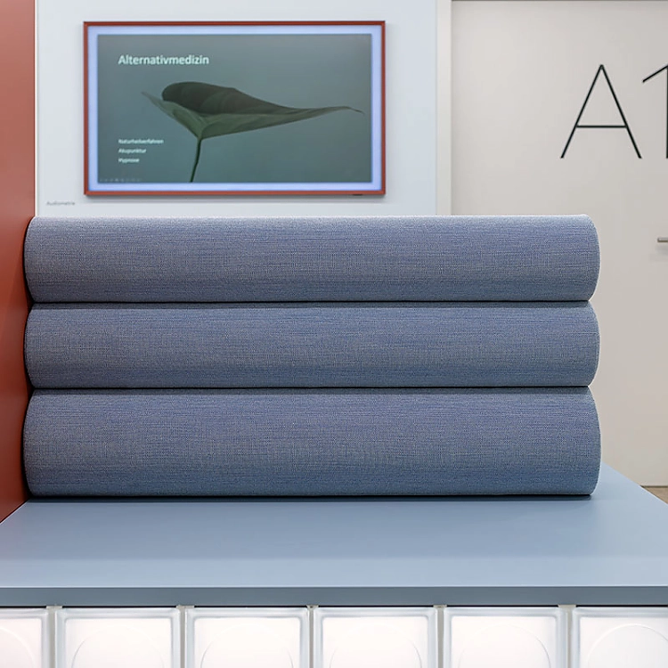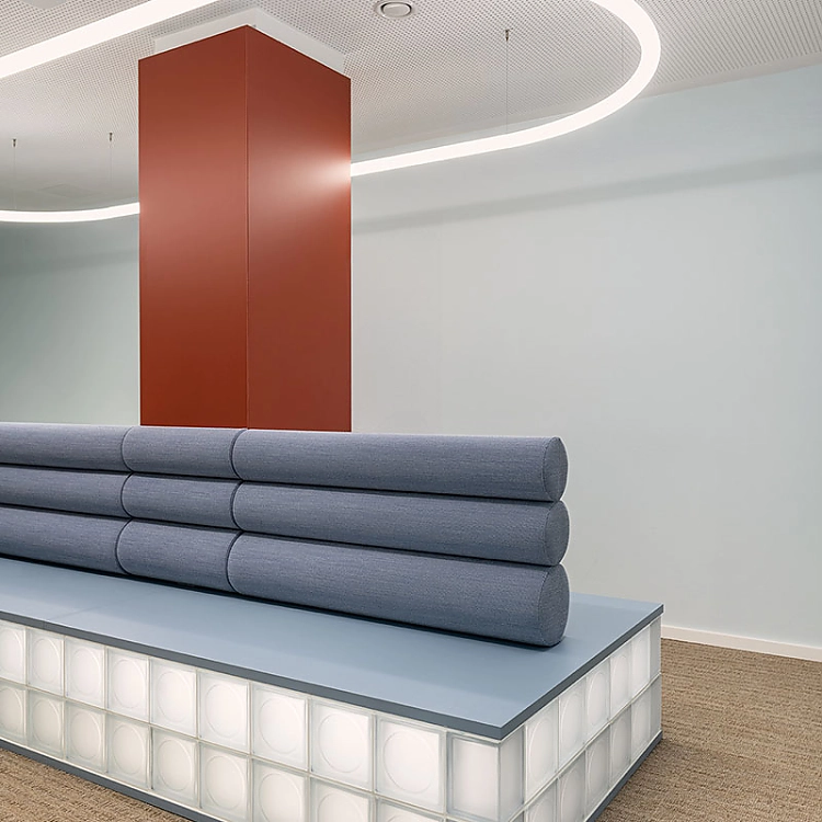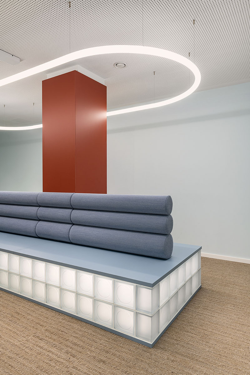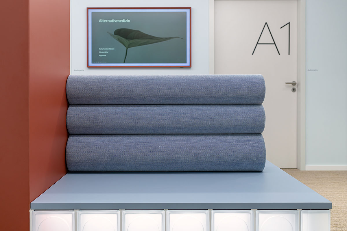 Bei der nutzerorientierten Gestaltung der Räume lagen vor allem das Material und die Akustik im Vordergrund. Darüber hinaus unterstützt ein unaufdringliches, ausbalanciertes Farbkonzept die Orientierung der Patienten, ergänzt durch ein unaufdringlich integriertes Wegeleitsystem von Designer David Steingrüber. Akzente in Oxidrot sorgen dabei für subtile visuelle Unterbrechungen, die den Blick führen und die Navigation erleichtern. Die Materialauswahl folgt einem bewussten Kontrast: Warme, natürliche Materialien wie Eichenholz stehen im Spannungsverhältnis zu funktionalen Oberflächen wie dem Kautschukboden, der eine kühle Note einbringt. Dieses Zusammenspiel sorgt für ein harmonisches Gesamtbild und unterstützt gleichzeitig die zielgerichtete Gestaltung der Räume unter Berücksichtigung der medizinischen Anforderungen.