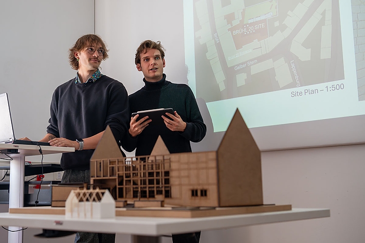 Bis vor einigen Jahren wurde das Gebäude von der HAWK als Bibliothek genutzt, aktuell finden in dem Fachwerkhaus Vorlesungen und andere Veranstaltungen statt. "Dafür sind das Gebäude und die Ausstattung aber nicht ideal", erklärt Weber. Die Aufgabe für die teilnehmenden Studierenden war es also, die historische Bausubstanz zu erhalten und gleichzeitig einen modernen, barrierefreien Lernort für Studierende zu schaffen. Dabei leitete Weber die Studierenden gemeinsam mit Dipl. Ing. Pia Danner und Dipl. Ing. Thomas Kauertz von der HAWK-Fakultät Bauen und Erhalten an. Martin Kuhlenkamp von der Fakultät Gestaltung unterstützte die angehenden Architektinnen und Architekten und Innenarchitektinnen und Innenarchitekten bei den Detailausarbeitungen und der Entwicklung ihrer Modellbauten. Bei der Präsentation der Entwürfe war außerdem Christopher Machold vom International Office der HAWK als Gastkritiker mit dabei.