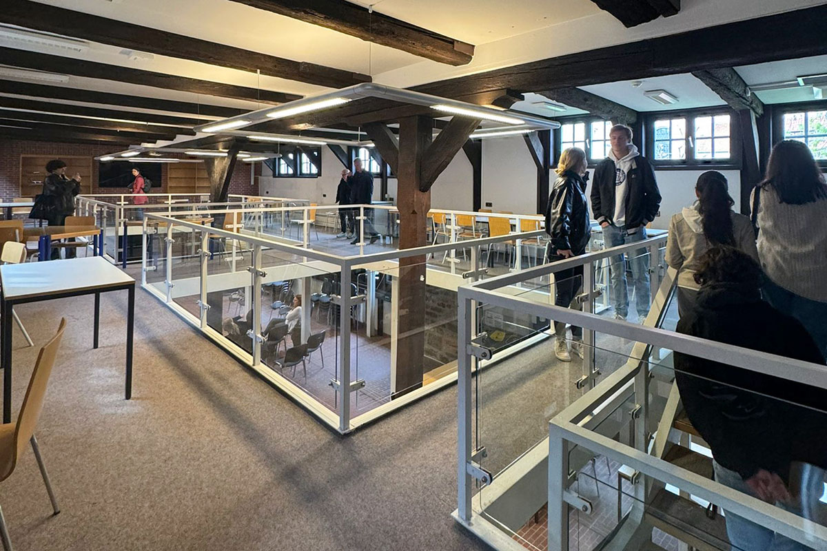 Herausgekommen sind fünf unterschiedliche Entwürfe, die dem historischen Gebäude neues Leben einhauchen sollen: mit Lern- und Aufenthaltsbereichen, einer Bar, einem Wintergarten oder sogar einem Second-Hand-Shop für Studierende. Für die Aufteilung des großen Raumes nutzten die Studierenden ganz unterschiedliche Ansätze: Glaswände, lange Paneele, die auch als Ausstellungsfläche dienen, oder einen neuen Anbau aus Beton.