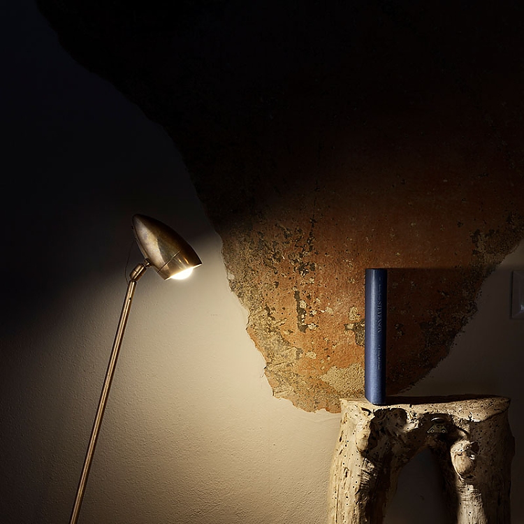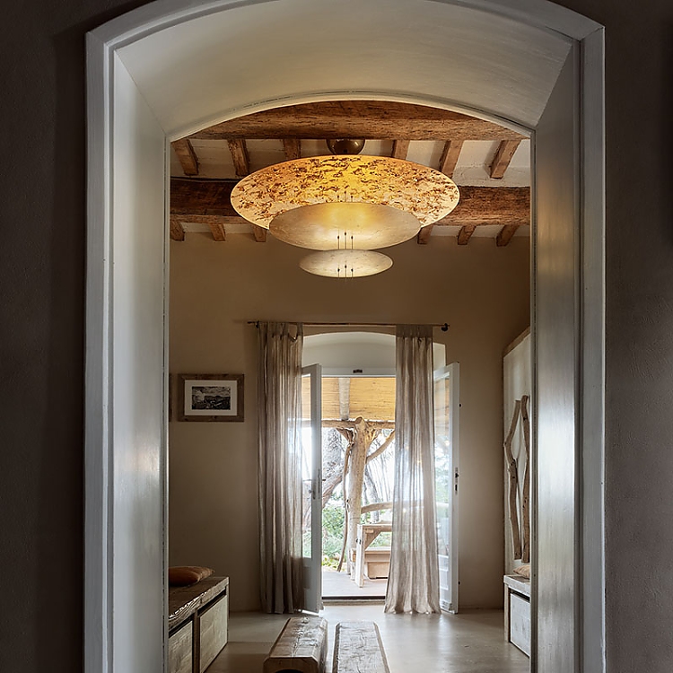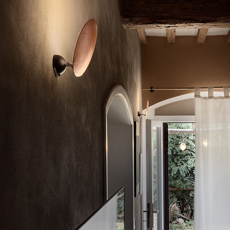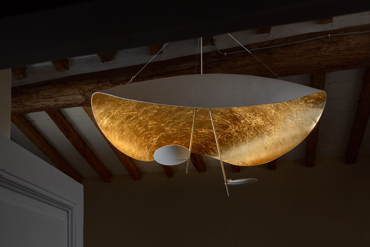Das Lichterlebnis beginnt bereits am Eingang mit den Wandleuchten Lederam W1, die mit elegantem Blattkupfer veredelt sind. Im gemütlichen Wohnbereich im Erdgeschoss geben die Stehleuchte CicloItalia aus Messing und die auffällige Macchina della Luce – eine der ikonischsten Kreationen von Catellani & Smith – den Ton an. Dieses zwischen Kunst und Design angesiedelte skulpturale Werk zieht nicht nur aufgrund seiner großzügigen Größe die Aufmerksamkeit auf sich, sondern auch wegen der goldfarbenen Blätter, die seine drei Scheiben bedecken und ein warmes, einhüllendes Licht in den Raum werfen.
