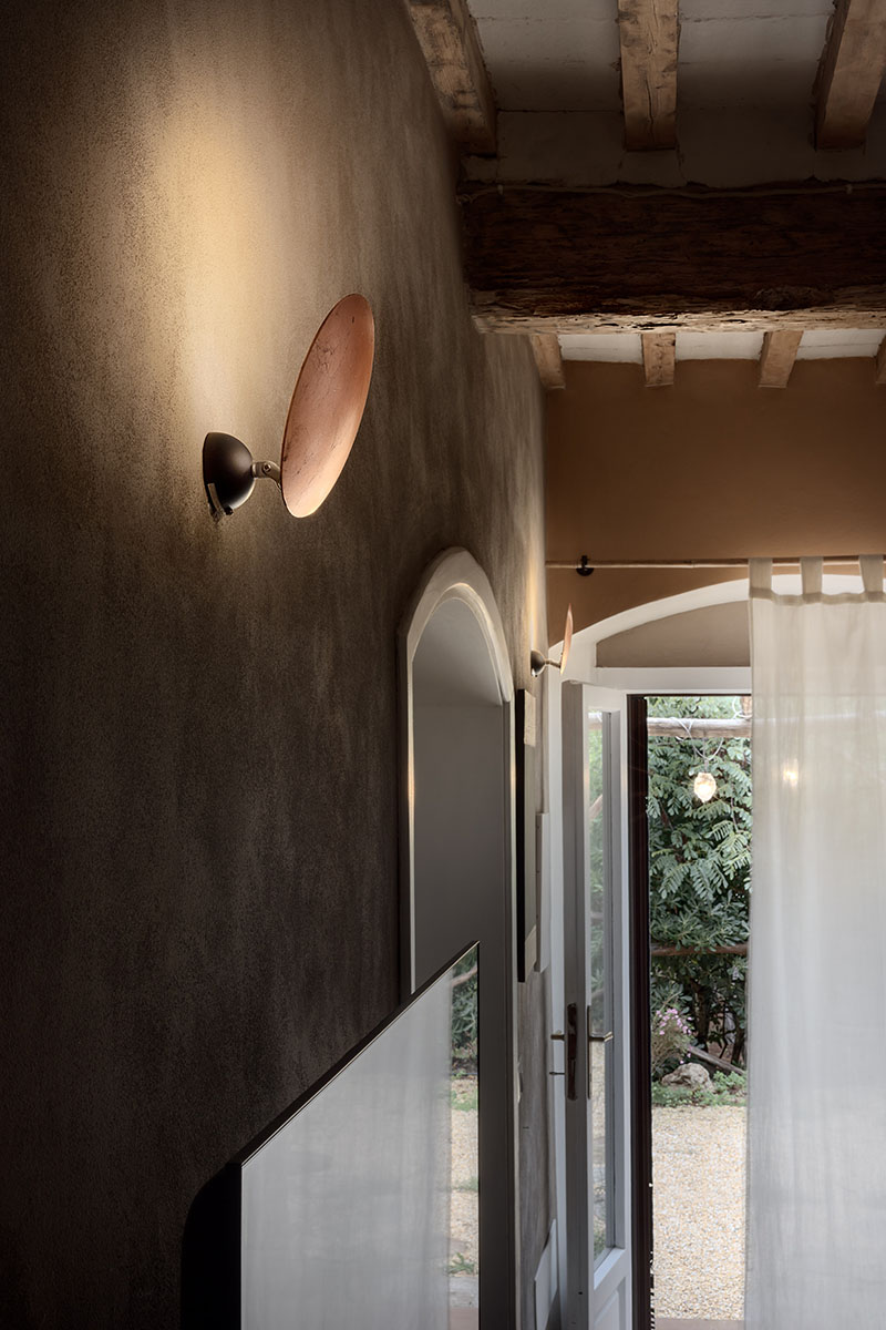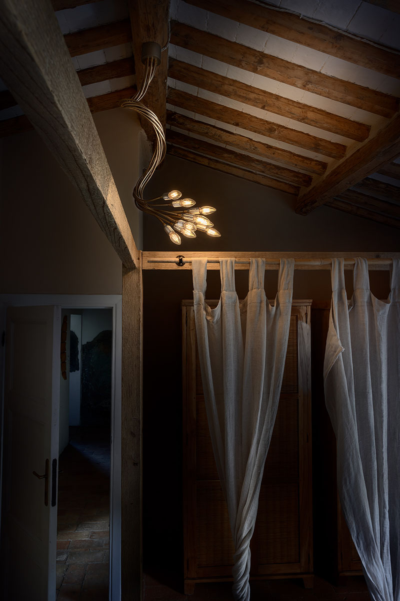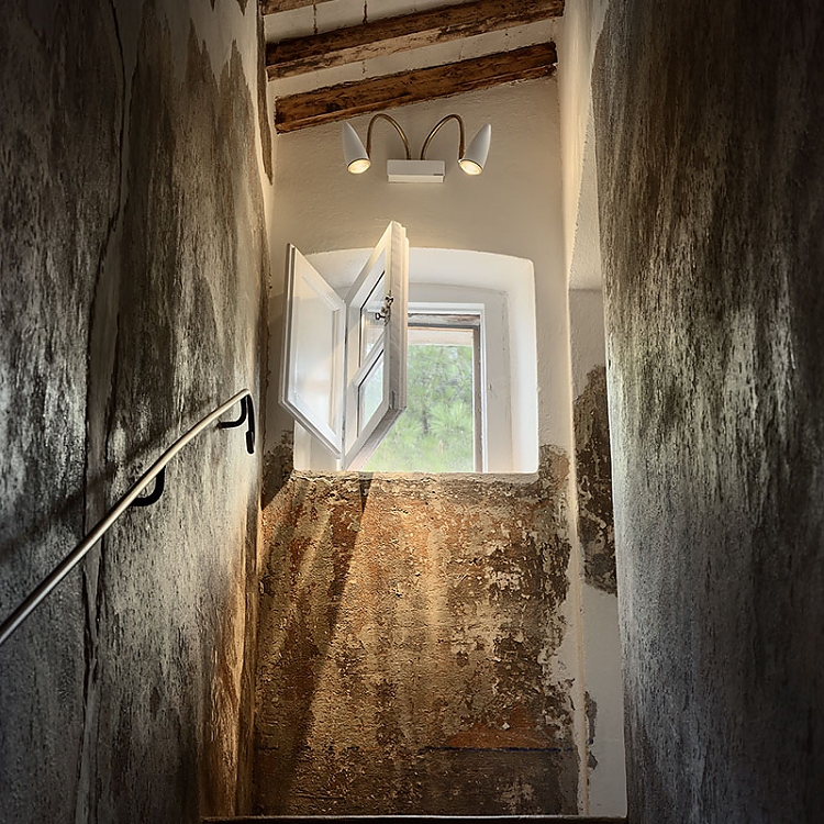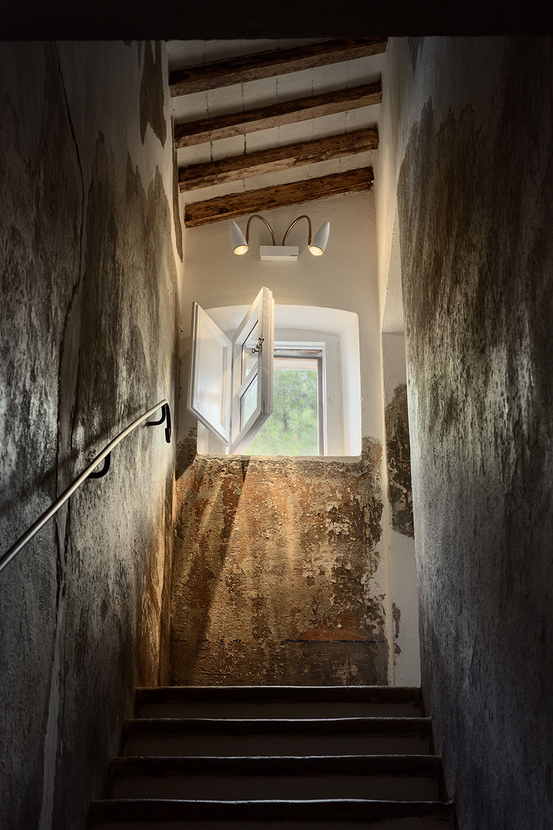 Die Küche, die sich durch freiliegende Holzbalken und einen rustikalen Steinofen auszeichnet, wird von Lucenera 503 und der handbemalten PostKrisi 51 in Weiß beleuchtet, die über dem Esstisch hängt. Die Wandleuchte CicloItalia mit zwei flexiblen Armen beleuchtet die Treppe, die zum Obergeschoss führt, wo sich zwei Schlafzimmer und ein Badezimmer befinden.