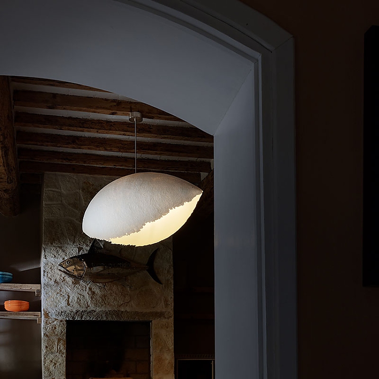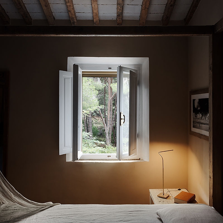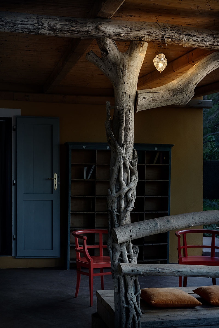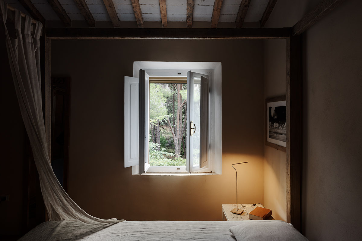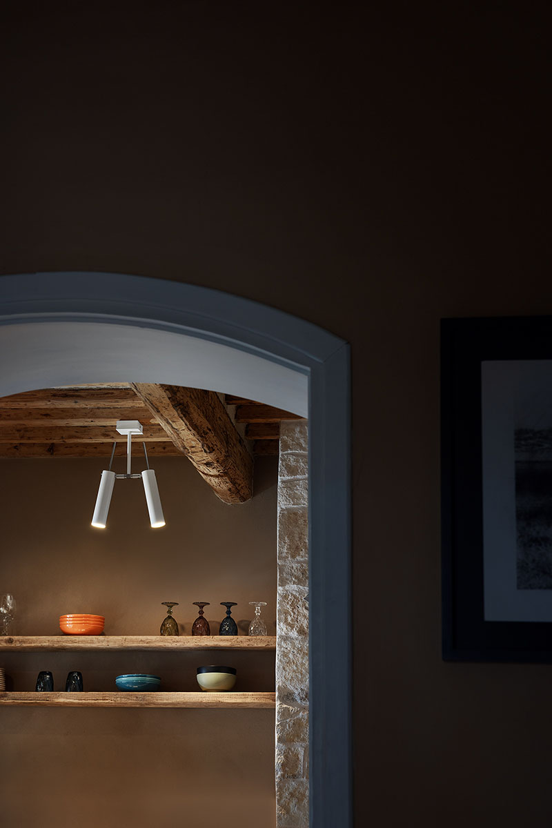 Die Küche, die sich durch freiliegende Holzbalken und einen rustikalen Steinofen auszeichnet, wird von Lucenera 503 und der handbemalten PostKrisi 51 in Weiß beleuchtet, die über dem Esstisch hängt. Die Wandleuchte CicloItalia mit zwei flexiblen Armen beleuchtet die Treppe, die zum Obergeschoss führt, wo sich zwei Schlafzimmer und ein Badezimmer befinden.