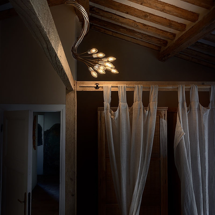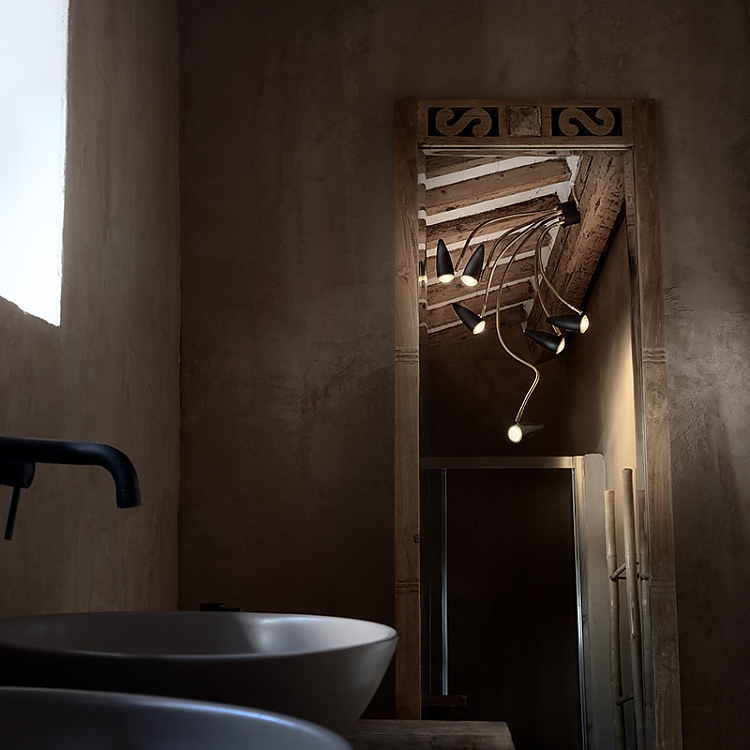 Im zweiten Schlafzimmer steht eine Turciù-Pendelleuchte mit neun flexiblen Armen im Mittelpunkt. Auf dem Nachttisch steht eine Lola-Tischleuchte, deren flexibler Arm eine präzise Einstellung der Beleuchtung für unterschiedliche Bedürfnisse ermöglicht. Im Badezimmer, über dem Waschbecken, erzeugt die minimalistische Eleganz von Light Stick in Satingold ein zartes Spiel aus Licht und Schatten an der Wand, während eine CicloItalia mit sechs flexiblen Armen und schwarzem Sockel den Duschbereich beleuchtet und das gesamte Ambiente aufwertet.