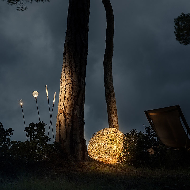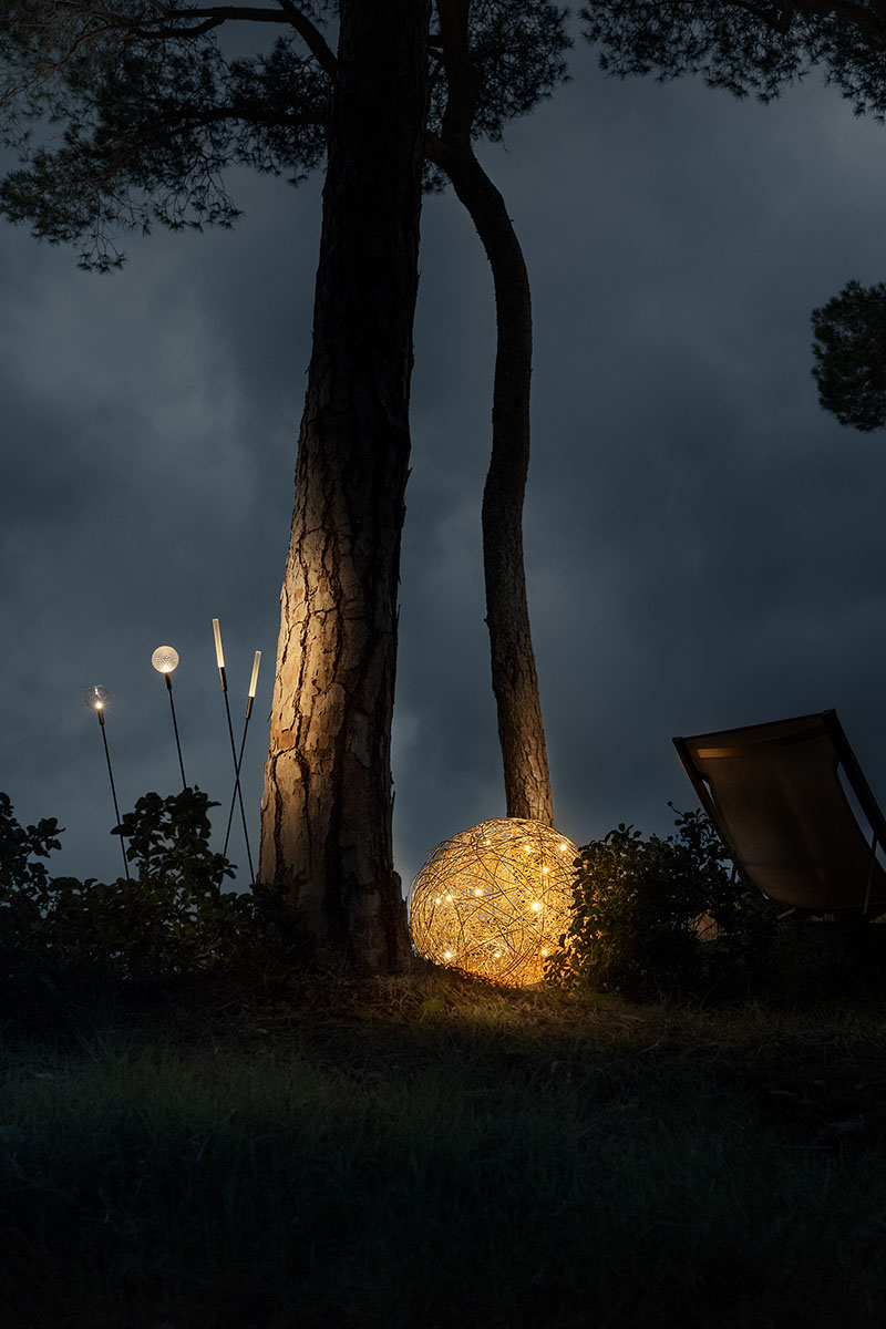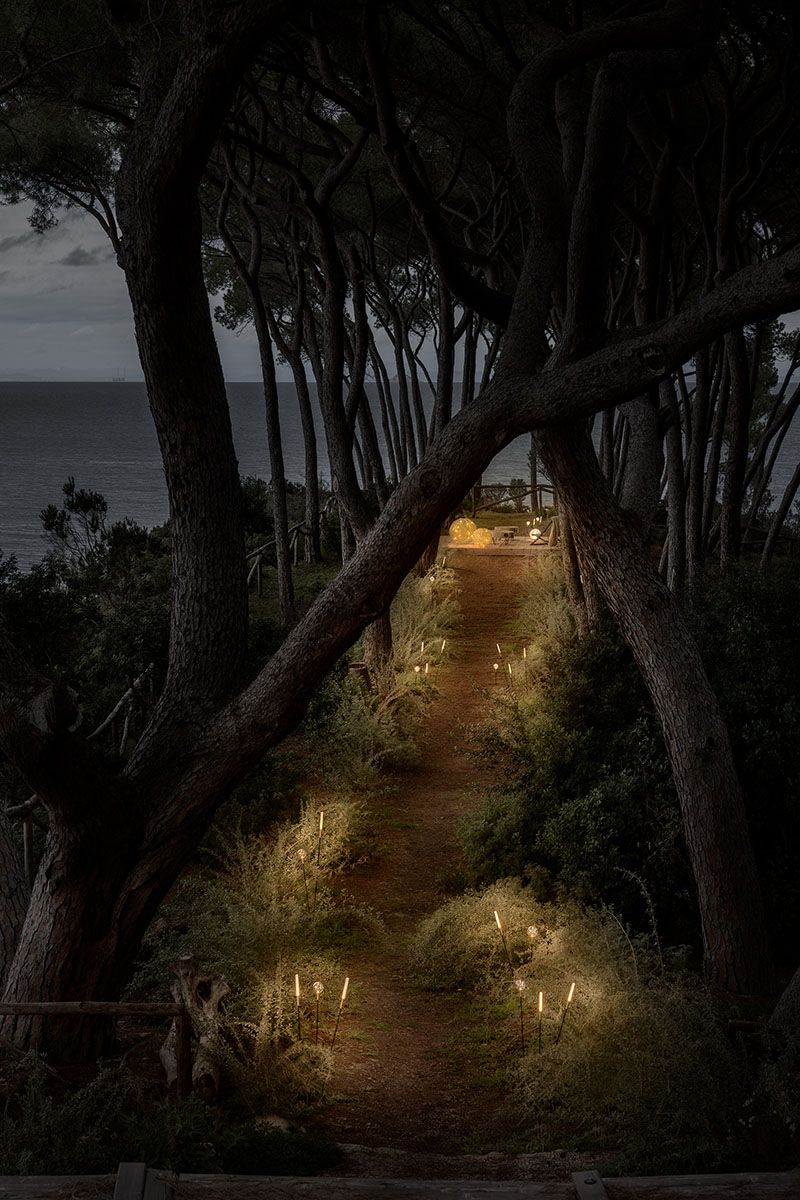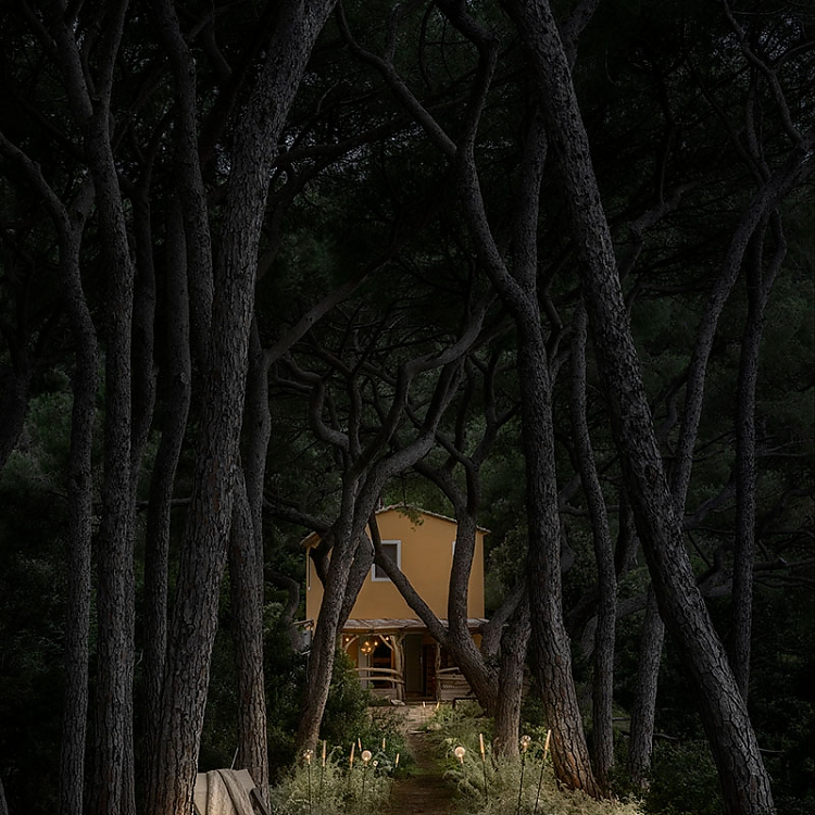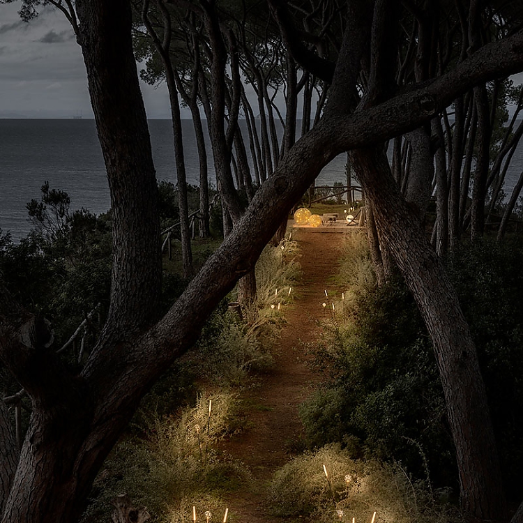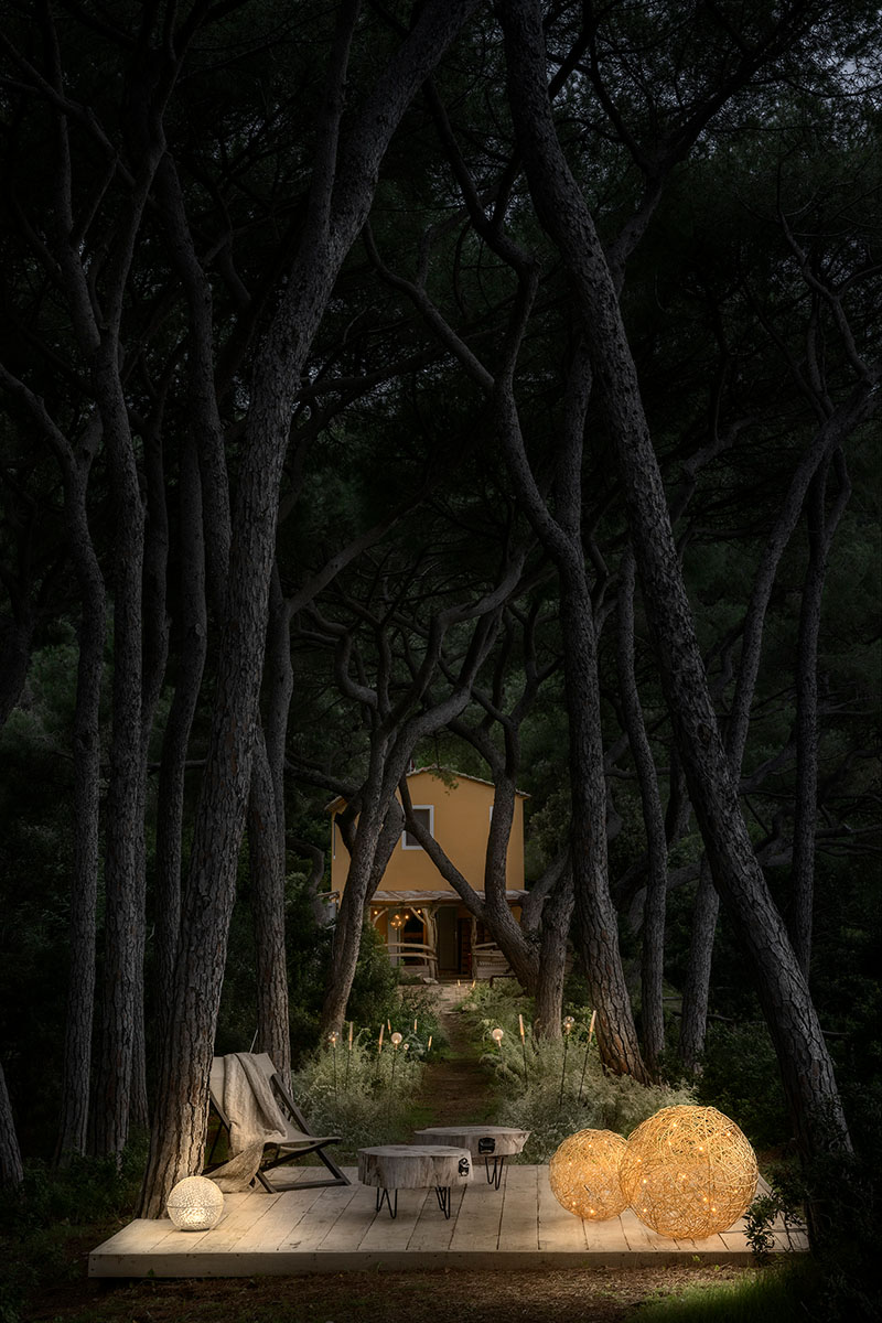 Vor der Villa öffnet sich ein Pinienwald zum Meer hin – ein natürlicher Korridor, der zu einem abgeschiedenen Entspannungsbereich inmitten von Grün führt, der durch zwei goldene Fil de Fer-Stehleuchten und die ätherische Medousê verzaubert wird. Hier, inmitten der Düfte von Harz und Meeresbrise, wird die Natur zu einer Bühne für Frieden und Schönheit. Zarte Lichter – Syphasera, Syphasfera und Syphaduepassi – tauchen die Landschaft in ein magisches Leuchten.