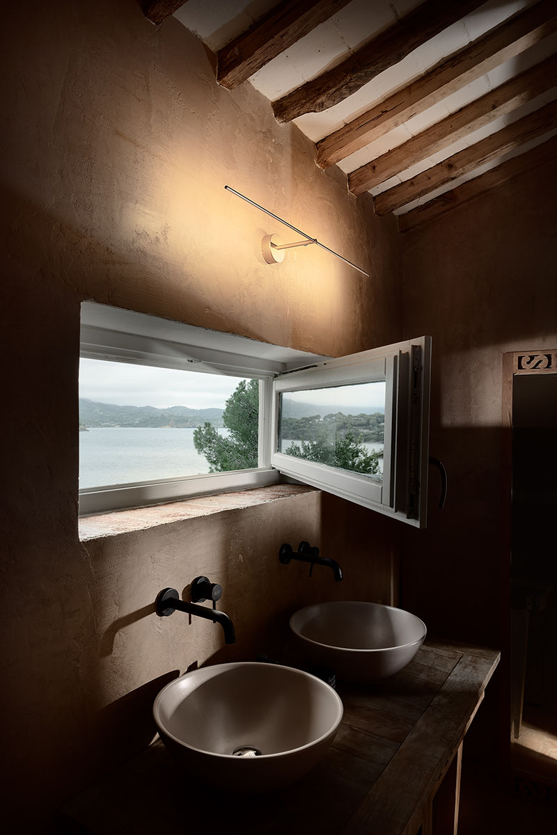 Die Villa Calanova erstreckt sich über zwei Etagen und verfügt über ein Wohnzimmer, eine Küche, zwei Schlafzimmer und zwei Badezimmer, die alle sorgfältig gestaltet wurden, um das natürliche Licht und den authentischen Charakter der Insel zu unterstreichen. Natürliche Materialien – insbesondere Holz – und warme Farbtöne harmonieren perfekt mit den rustikalen Möbeln und dem modernen Design der Leuchten von Catellani & Smith.