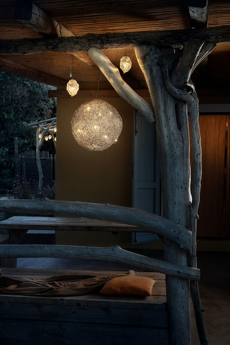 Auch außerhalb der Villa Calanova geht der Licht-Zauber weiter. Im gemütlichen überdachten Innenhof leuchten mehrere hängende More-Leuchten sanft zwischen den Holzbalken, wie leuchtende Früchte, die in der Luft hängen, während das dezente Licht der Fil de Fer-Leuchte den Esstisch im Freien erhellt.