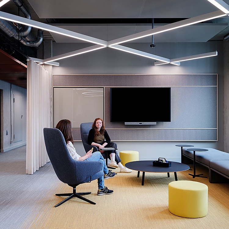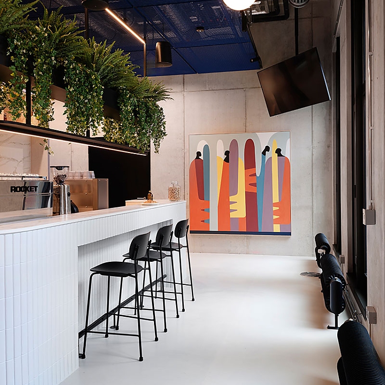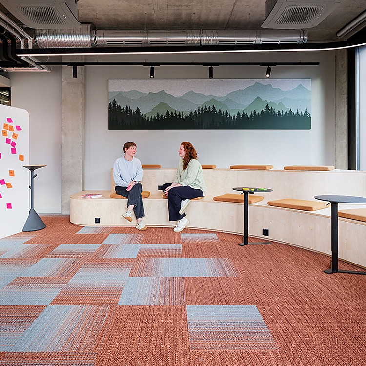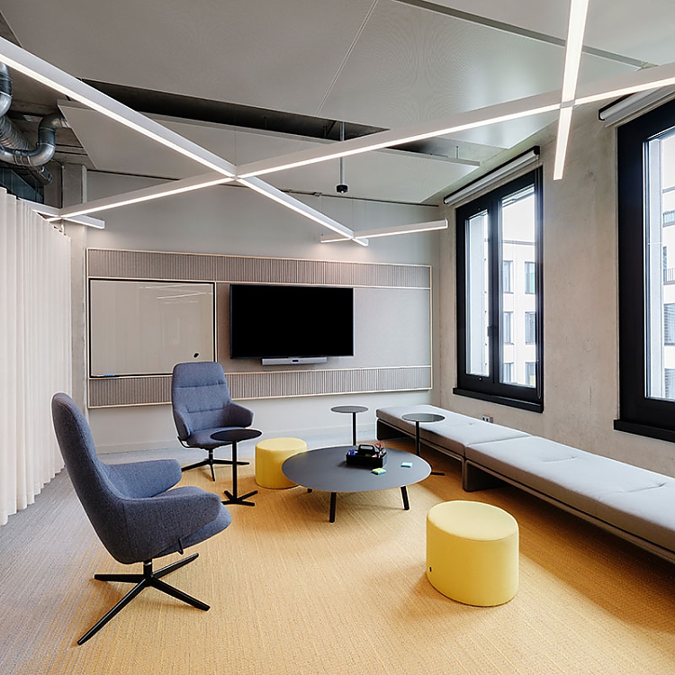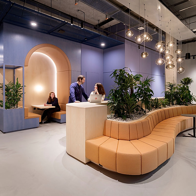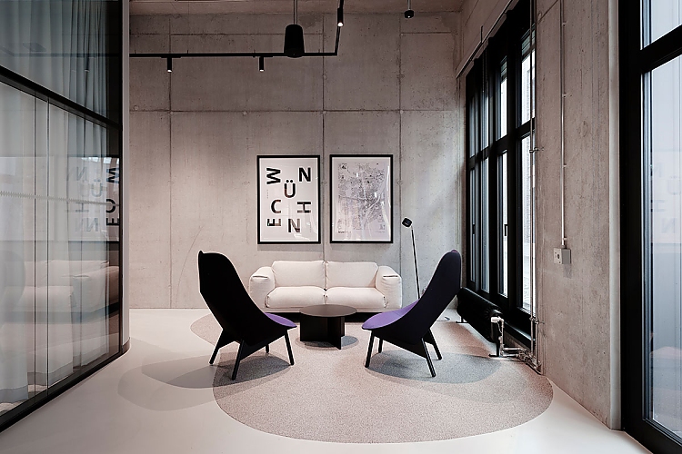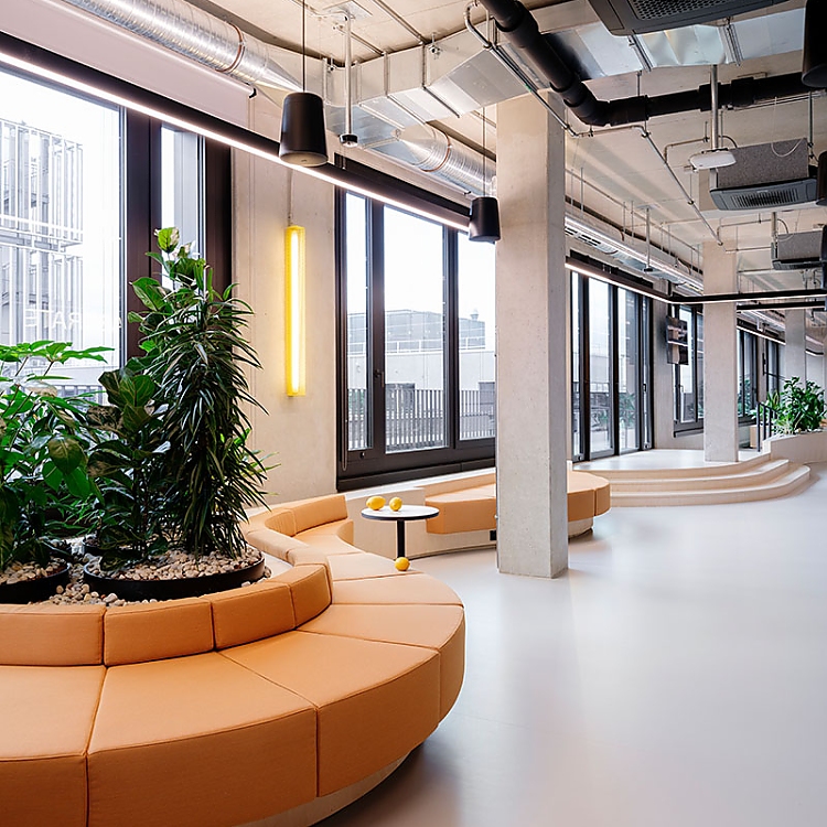 Die geliebte Isar wiederum schlängelt sich als geschwungene Sitzbänke durch den Hub, die große Gemeinschaftsfläche im 3. Obergeschoss. Auch die extra angefertigte Kunst an den Wänden in Kollaboration mit Münchener Künstlern zeigen eine moderne Interpretation des Münchener Lebens. Ergänzt um abstrakte Bergmotive und eine üppige Bepflanzung, entsteht hier ein Gefühl von organisch-fließender Landschaft – sodass die international Mitarbeitenden das Spezielle des Standortes spüren können und sich zudem im Büro wohl und zu Hause fühlen können.