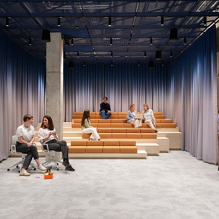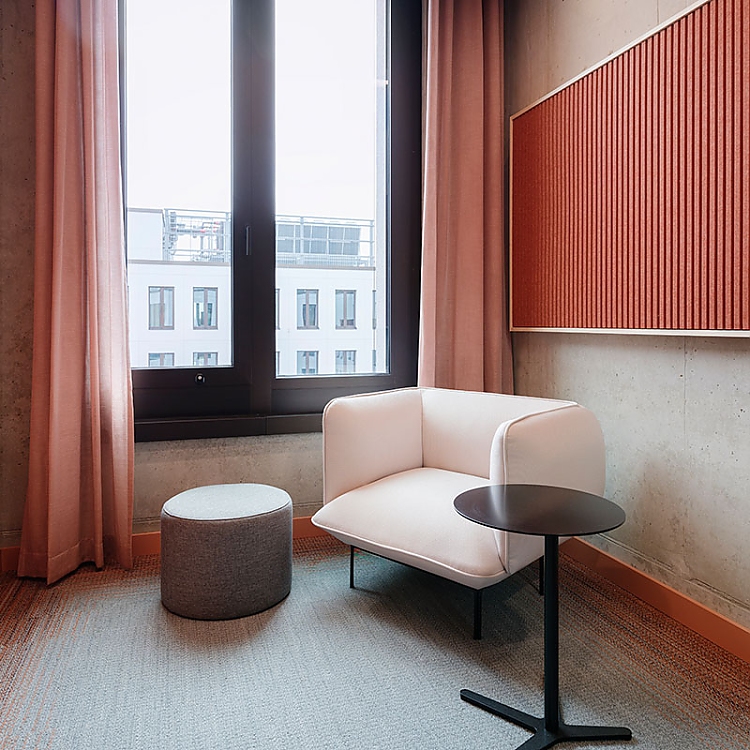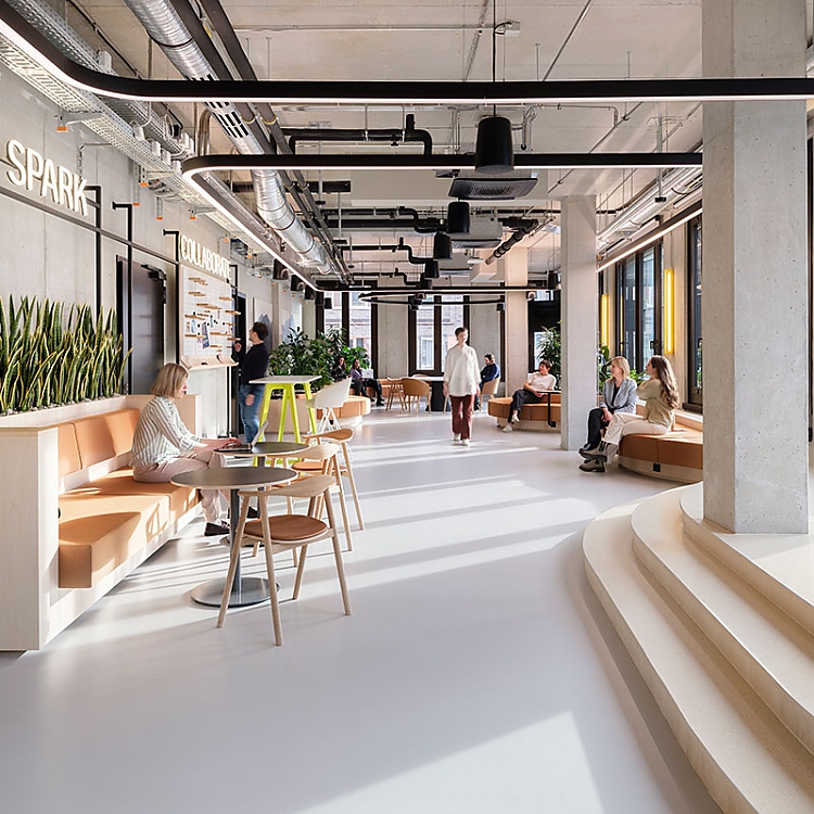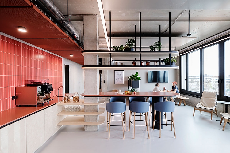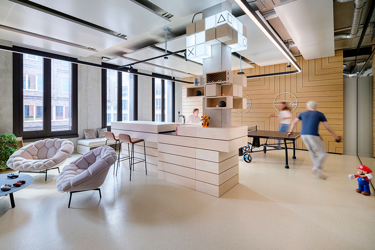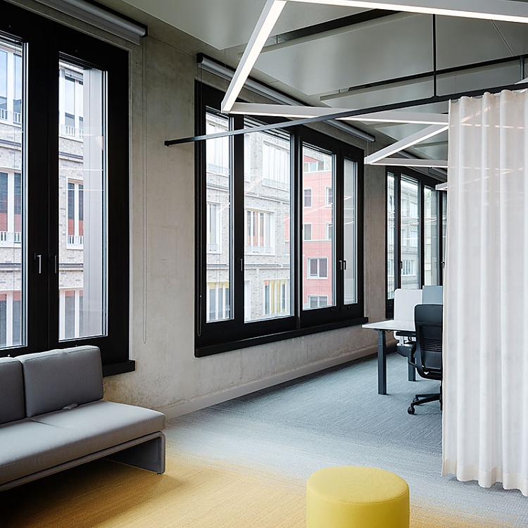 Die überwiegende Zahl der insgesamt ca. 220 Sitz- und Arbeitsgelegenheiten richtete Kinzo an Orten mit teilweise informellem Charakter ein, darunter Besprechungs- und Workshopräume, aber auch eine Bibliothek, Cafés und Gemeinschaftsflächen in unterschiedlichster Ausstattung und Möblierung – immer analog und digital funktional. Dabei charakterisieren einige wiederkehrende Ausstattungselemente die Räume, wie etwa der Bodenbelag. Im Erdgeschoss ist es durchgängig Beton, während in den Obergeschossen Teppichboden mit unterschiedlichen, farbigen Verläufen verlegt wurde. Der Farbcode: Gelb steht für Kollaboration, Dunkelgrau für Einzel- und Fokusarbeit und Rot oder Blau stehen für Kommunikation. Analog dazu sind die Decken in den Flurbereichen mit farbigen Streckmetallpaneelen verkleidet. Damit sich die Stockwerke optisch besser unterscheiden lassen, ist es in einem Stock oben Blau, unten Rot, im anderen Stock oben Rot, unten Blau. Ein weiteres Gestaltungselement sind die zahlreichen aufwendigen Einbauten, die zwischen Möbel und Innenarchitektur changieren und die auf verschiedenen Ebenen Funktionen wie Sitzgelegenheit, Empfang, Aufbewahrung oder Pflanzkübel umfassen.