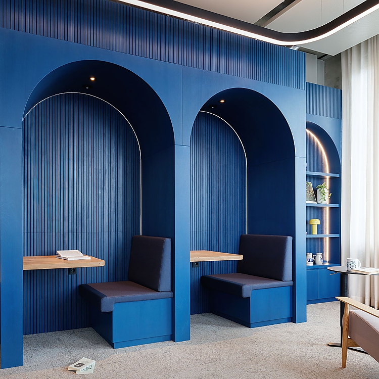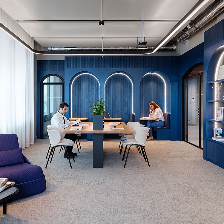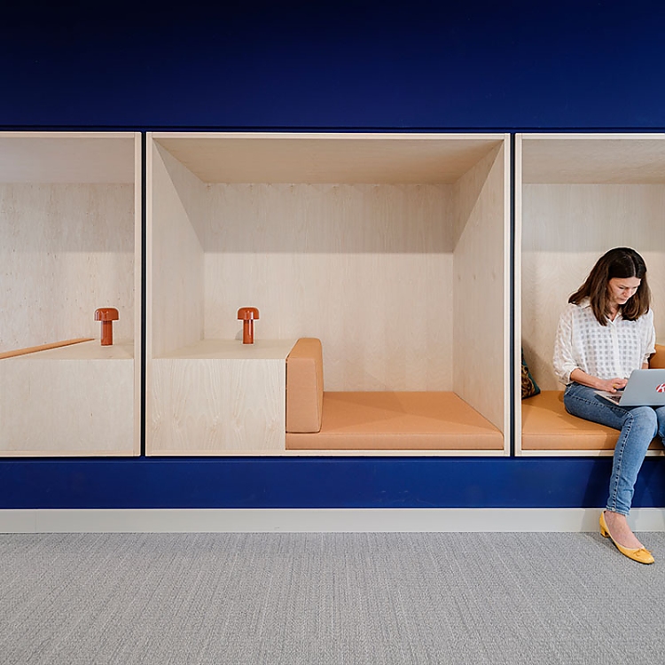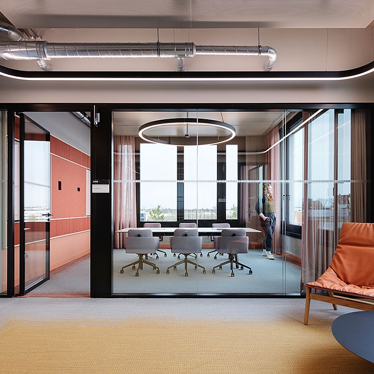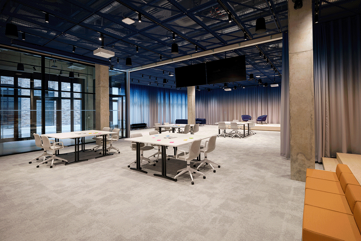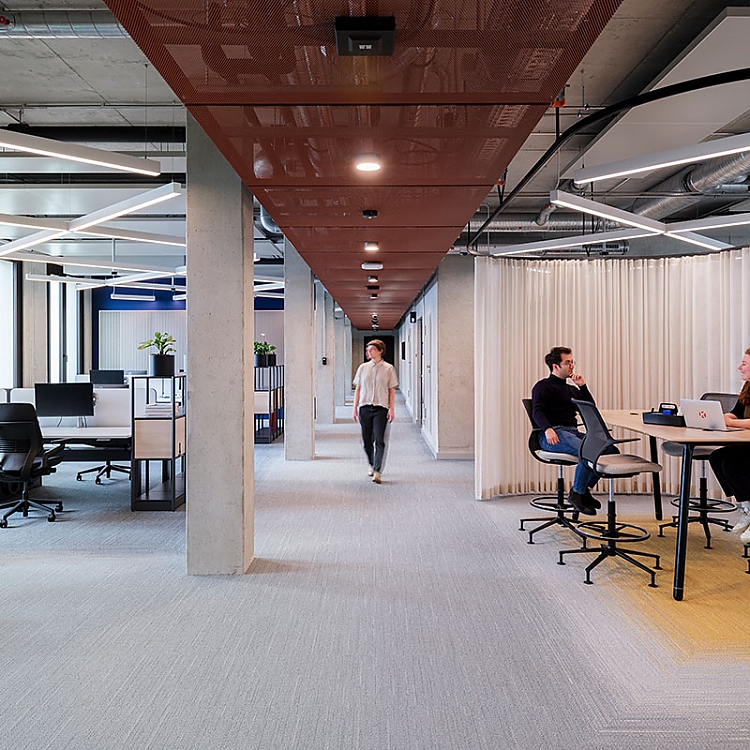 Die überwiegende Zahl der insgesamt ca. 220 Sitz- und Arbeitsgelegenheiten richtete Kinzo an Orten mit teilweise informellem Charakter ein, darunter Besprechungs- und Workshopräume, aber auch eine Bibliothek, Cafés und Gemeinschaftsflächen in unterschiedlichster Ausstattung und Möblierung – immer analog und digital funktional. Dabei charakterisieren einige wiederkehrende Ausstattungselemente die Räume, wie etwa der Bodenbelag. Im Erdgeschoss ist es durchgängig Beton, während in den Obergeschossen Teppichboden mit unterschiedlichen, farbigen Verläufen verlegt wurde. Der Farbcode: Gelb steht für Kollaboration, Dunkelgrau für Einzel- und Fokusarbeit und Rot oder Blau stehen für Kommunikation. Analog dazu sind die Decken in den Flurbereichen mit farbigen Streckmetallpaneelen verkleidet. Damit sich die Stockwerke optisch besser unterscheiden lassen, ist es in einem Stock oben Blau, unten Rot, im anderen Stock oben Rot, unten Blau. Ein weiteres Gestaltungselement sind die zahlreichen aufwendigen Einbauten, die zwischen Möbel und Innenarchitektur changieren und die auf verschiedenen Ebenen Funktionen wie Sitzgelegenheit, Empfang, Aufbewahrung oder Pflanzkübel umfassen.