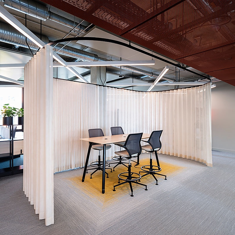 Der neue, von Kinzo realisierte Münchner Standort erstreckt sich über drei Etagen und belegt 570 qm im Erdgeschoss, 2.500 qm im dritten und 2.100 qm im vierten Obergeschoss. Da hier überwiegend Sales-Mitarbeitende tätig sind, die interne und externe Kollaborationen betreuen, bedarf es mehr als klassische Schreibtisch-Arbeitsplätze. Davon gibt es entsprechend nur 61 im dritten und 56 im vierten Obergeschoss. Neben flexiblen Gruppenarbeitstischen, kleineren Arbeits- und Besprechungsnischen gibt es zudem einen multifunktionalen Workshop- und Schulungsraum. Außerdem befinden sich im Erdgeschoss wie auch in Teilen des dritten Obergeschosses teilöffentliche Flächen, die überwiegend Schulungen und Kundenevents gewidmet sind. "Being A Good Host" wird hier großgeschrieben, weshalb unter anderem eine Barista-Bar und Catering-Küche nicht fehlen durften. Die restlichen Obergeschossflächen werden intern als Arbeits- und Kommunikationsbereiche genutzt. Hier gilt: Alle Plätze sind geteilt, Clean Desk ist gelebter Standard. Für einige Teams wurden sogenannte Teamheimaten oder Nachbarschaften definiert, in denen sich die Mitarbeitenden meist aufhalten.