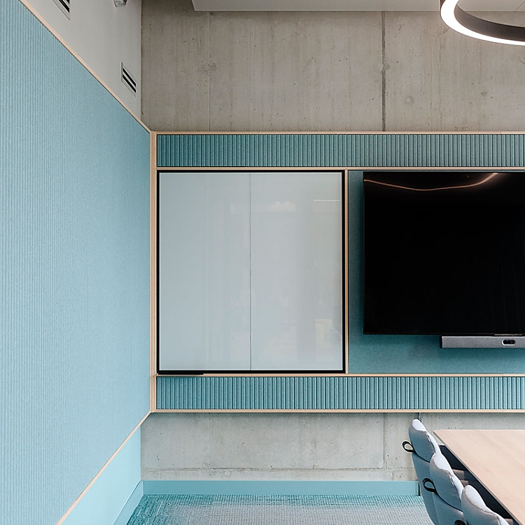 Ansonsten setzte das Kinzo-Team Lokalkolorit eher subtil als dekorativ ein. So findet sich die bayerische Raute in Variationen wieder, etwa bei im Zick-Zack gehängten Pendelleuchten, im Wandregal am Empfang oder als Muster bei Einbauten oder Fliesen. Die große, agile Arbeitsfläche im Erdgeschoss, welche als Trainingsraum für Kunden genutzt wird, lässt sich mit Vorhängen zonieren, deren blau-weißer Farbverlauf an den sprichwörtlichen Münchner Himmel denken lässt. Und der für örtliche Altbauten typische Rillenputz war Vorbild für das vertikale Relief der Akustikpaneele.