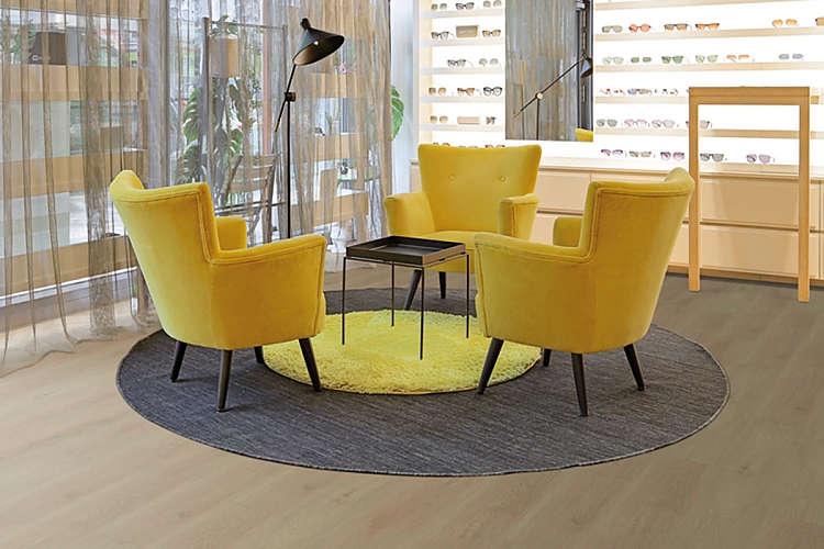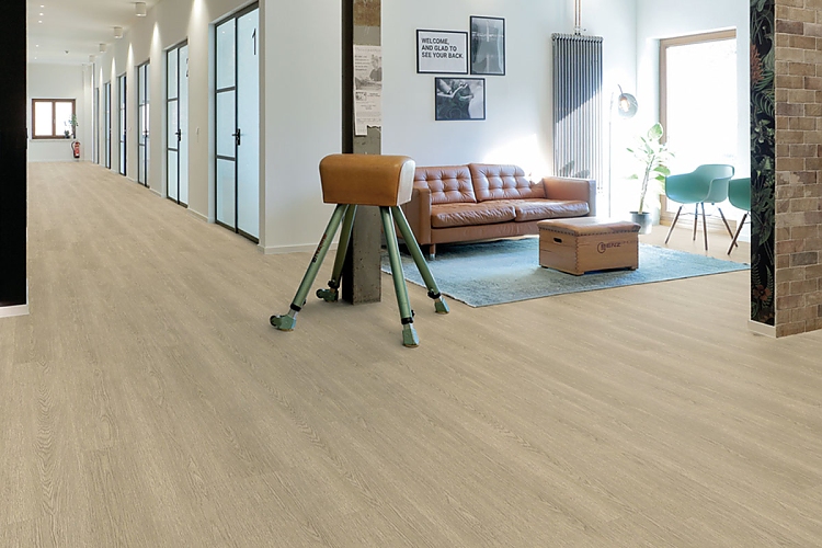Das neue Format 1500 × 228 mm zum vollflächigen Verkleben unterstreicht den großzügigen Charakter der Kollektion. Zehn sorgfältig abgestimmte Designs bilden die Basis für moderne, elegante Räume. Die 0,55 mm starke Nutzschicht mit bewährten technischen Eigenschaften der "floors@work"-Kollektion ermöglicht den Einsatz in allen Wohn- und Objektbereichen – vom Schlafzimmer bis zur Rooftop Bar.