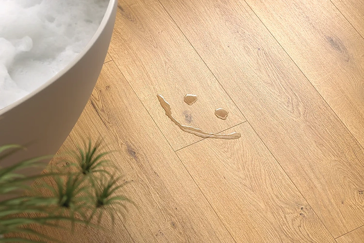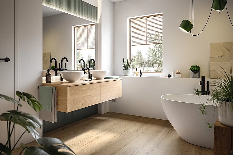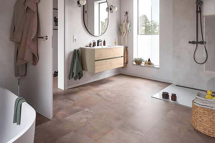 Die holzbasierten Laminat- und Hybridböden von Egger gibt es auch als wasserresistente Produkte, die sich in Feuchträumen wie Badezimmern und Küchen großer Beliebtheit erfreuen. Sie vereinen die Schönheit von Holzdekoren mit der Widerstandsfähigkeit und Wasserresistenz moderner Fußbodenbeläge, sind leicht zu reinigen und bieten eine angenehme Haptik und bessere Raumakustik als Fliesen.