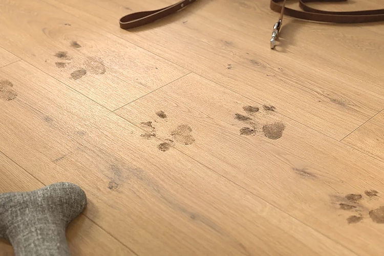 Der Premiumboden "NatureSense Aqua+" ist haustierfreundlich und alles andere als wasserscheu. Fotos: Egger Holzwerkstoffe