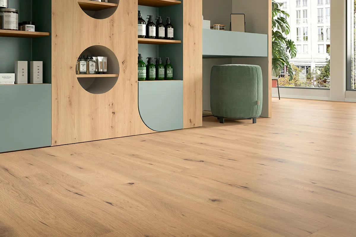 Der "AquaDura"-Boden vereint gutes Aussehen mit zuverlässigem Schutz und besteht nahezu alle Alltagsherausforderungen, egal in welchem Business. (Abb. EDF200 Wildeiche natur im Decor Match mit dem Regal H1318;ST10.)