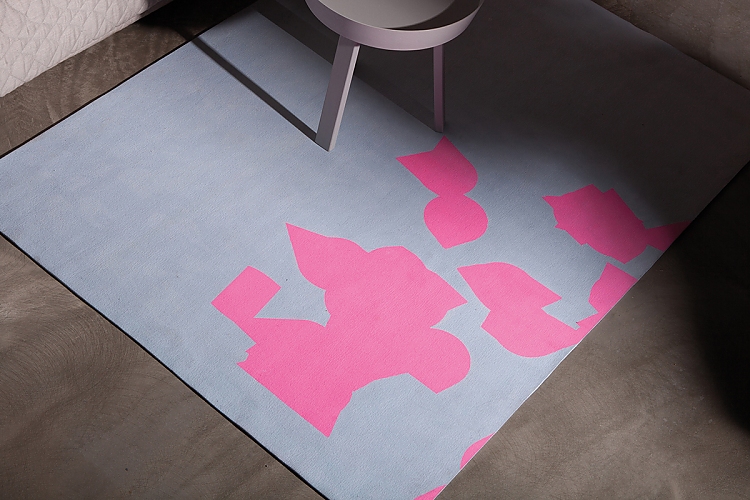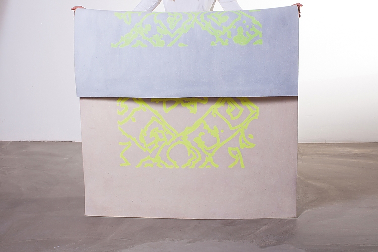 Die Kollektion umfasst wendbare Teppiche für Wand und Boden, passende Kissen sowie textile Bildobjekte. Jeder Teppich ist beidseitig bedruckt, zeigt zwei unterschiedliche Farbwelten und lässt sich mit einem Handgriff wenden – eine Idee, die Heidari Nami entwickelt hat, um Räumen spontan eine neue Stimmung zu verleihen. Durch diese Variationsmöglichkeiten entstehen mehrere Gestaltungsebenen innerhalb eines einzigen Stücks. Die Teppiche sind sowohl als Wandobjekt als auch als Bodenbelag nutzbar und werden in feinster Siebdrucktechnik, Stück für Stück, in Handarbeit gefertigt. Die verwendeten Wollfilze stammen aus Deutschland und den Niederlanden und werden im Studio in Hamburg zugeschnitten, gefärbt und bedruckt.