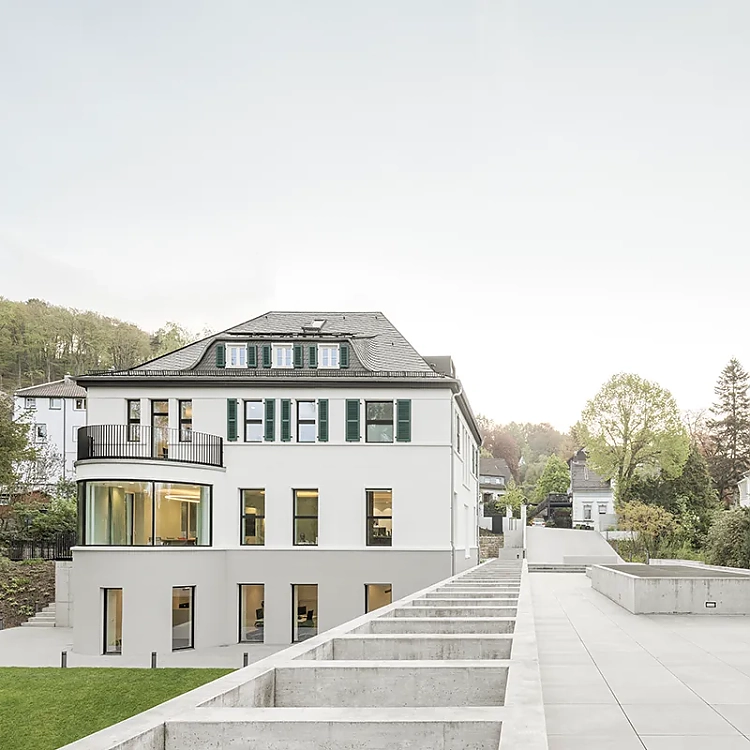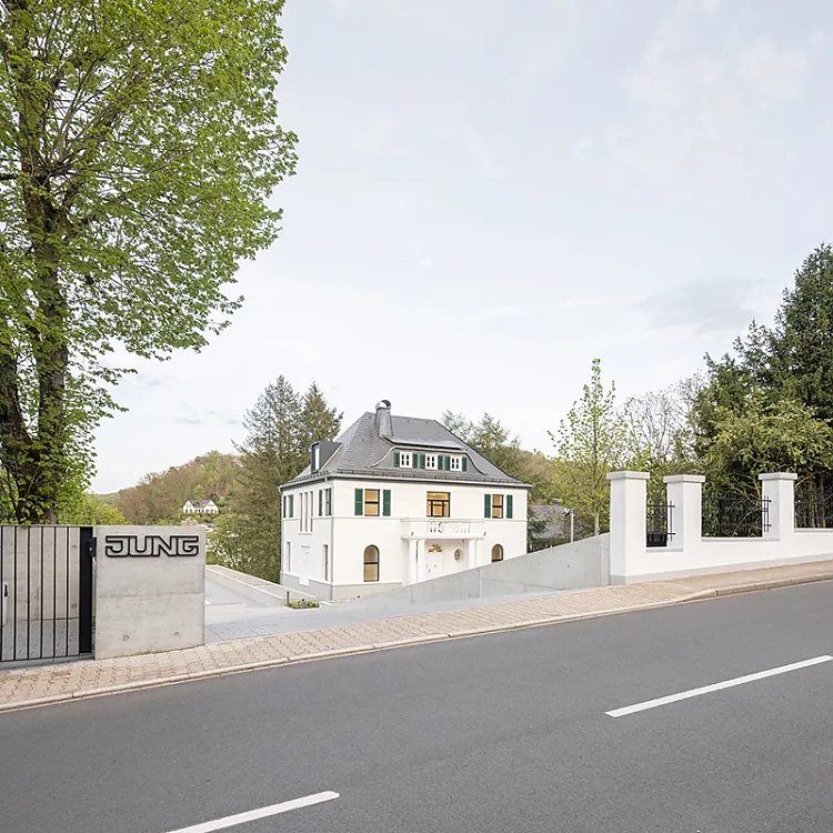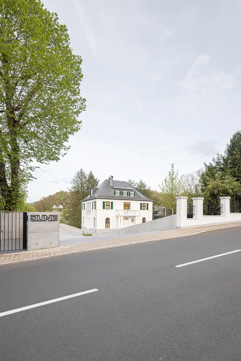 Der einstige Wohnsitz des Firmengründers Albrecht Jung in Schalksmühle findet als Think Tank, Begegnungs- und Dienstleistungszentrum der Marke Jung eine neue Bestimmung. Die Sanierung der historischen Villa aus dem Jahr 1928 und die Erweiterung um einen modernen Pavillon wurden von NGA Nehse & Gerstein Architekten BDA aus Hannover als Sieger eines offenen Architekturwettbewerbs realisiert. Die Jung-Gründervilla ist kein Showroom. Sie ist ein multifunktionales Büro-, Veranstaltungs- und Wohngebäude, bei dessen Sanierung und Betrieb die Themen Verantwortung, Haltung und Effizienz eine wichtige Rolle spielen.