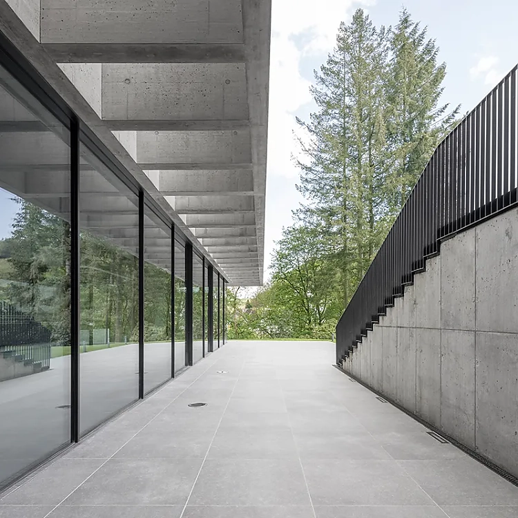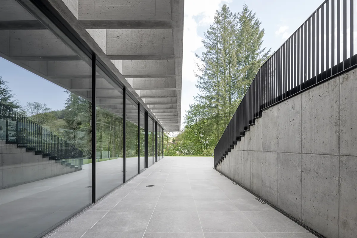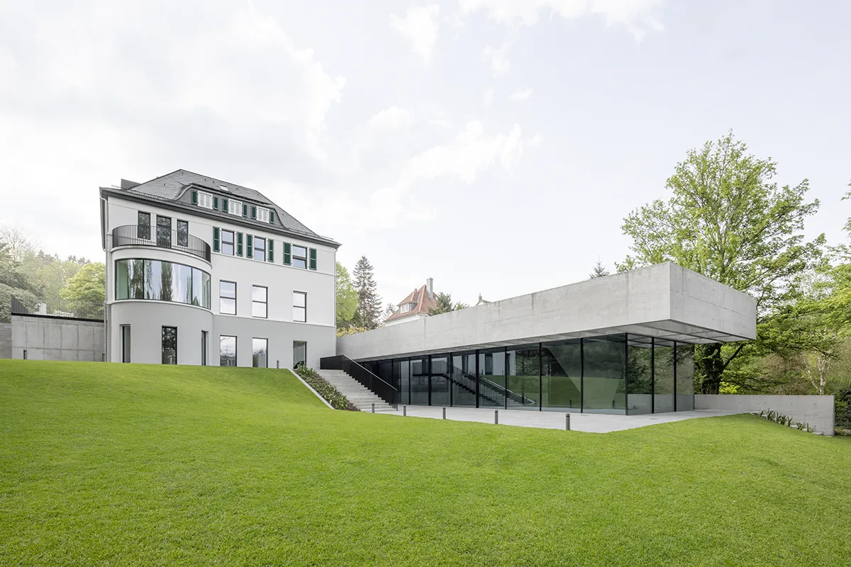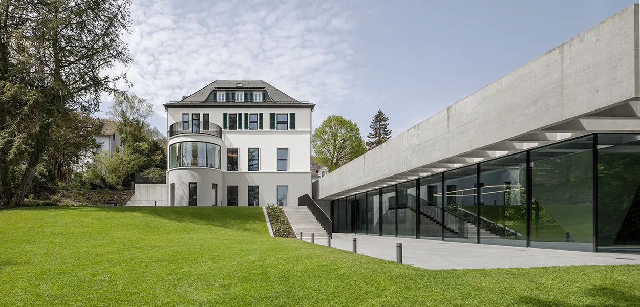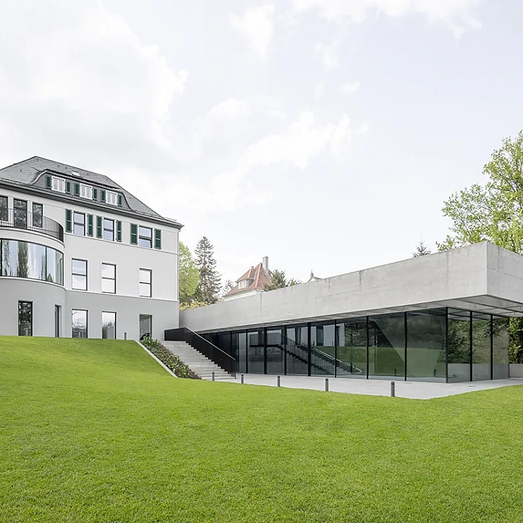 Eine Unterfangung des Kellergeschosses und das partielle Ergänzen eines neuen Geschosses ermöglichen den nahtlosen Anschluss des Neubaus an die Villa. Die Bodenplatte des Anbaus liegt fünfeinhalb Meter unter dem Erdgeschossniveau der Villa. Der schlichte Neubau, in dem sich die sogenannte Schalterhalle, ein großer Raum zur freien Nutzung, befindet, ist über eine skulpturale, mehrfach gekrümmte Stahltreppe mit dem Altbau verbunden. Der Neubau hebt sich gestalterisch mit Kassettendach, Sichtbeton und Glas deutlich von der Villa ab. Die Raumatmosphäre in der Schalterhalle wird maßgeblich durch die gestalterische Kraft von Konstruktion und Material bestimmt – lediglich eine große Stütze in Form einer umgedrehten Pyramide an der Ostseite des Veranstaltungsraums wirkt beliebig. Aber dem ist nicht so, sie trägt das schwere Betondach und folgt in ihrer Form dem Kraftverlauf. Den Planern von NGA gelingt es, mit möglichst wenigen Mitteln und einer sehr klaren Architektursprache ein Gebäudeensemble zu schaffen, das nun ganz im Stil von Jung sowohl die Vergangenheit als auch die Zukunft im Blick hat.