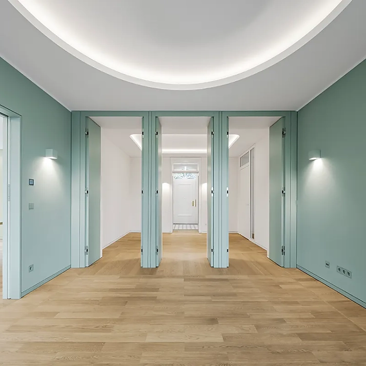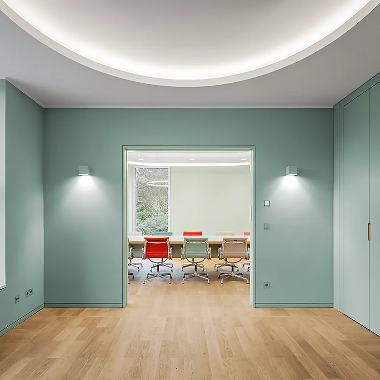 Die sanierte Jung-Gründervilla mit Teilneubau in Schalksmühle, einstiger Wohnsitz des Firmengründers Albrecht Jung, findet heute als Think Tank und Begegnungs- und Dienstleistungszentrum der Marke Jung eine neue Bestimmung. Sowohl bei der Sanierung als auch dem Betrieb spielen die Themen Verantwortung, Haltung und Effizienz eine wichtige Rolle. Mineralische Innenfarben von Keim unterstützen das Gestaltungskonzept und tragen zu einem gesunden Raumklima bei.