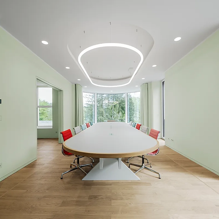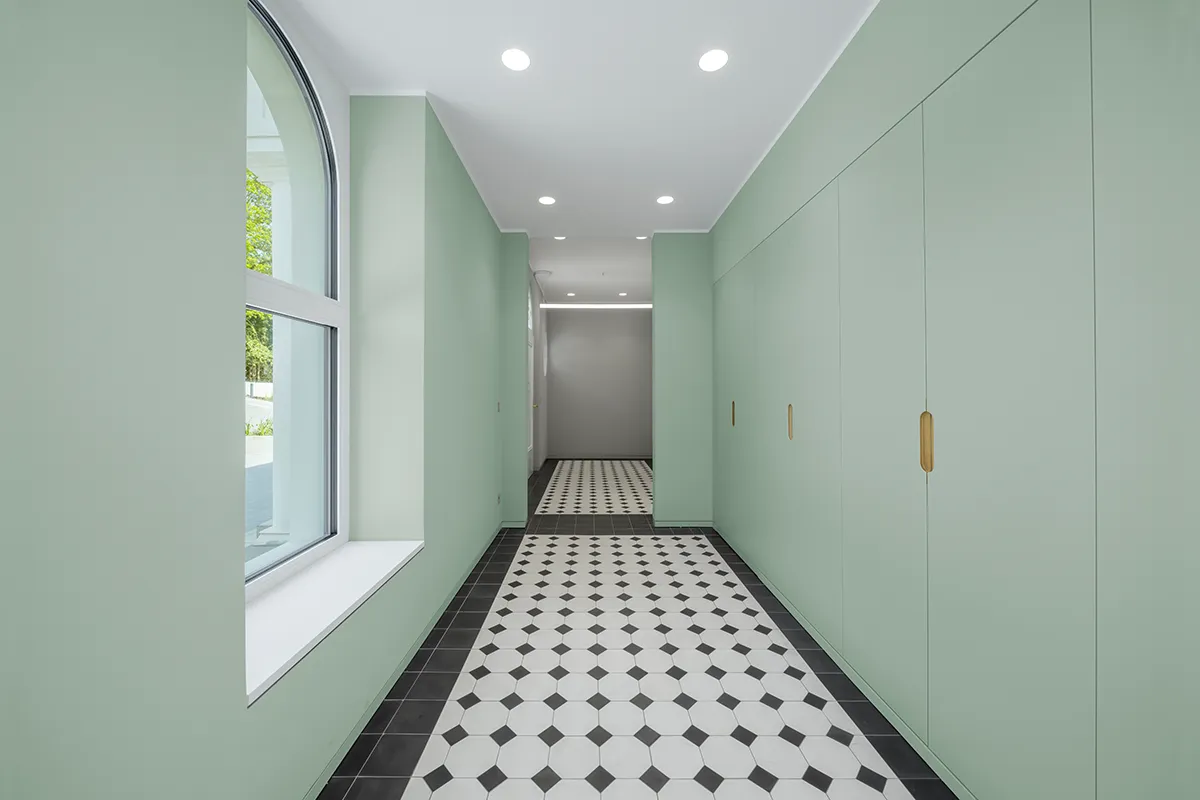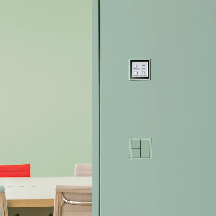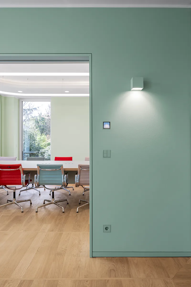 Dass ein Hersteller wie Jung modernste Technik verbaut, ist nicht verwunderlich. Natürlich ist die Gebäudetechnik smart und von Automatismen unterstützt, natürlich setzt das Beleuchtungskonzept auf Szenarien und Sensoren, natürlich sind Störmeldungen der Sanitärhebeanlage lokal und auch aus der Ferne per Smartphone empfangbar – um nur einige Beispiele aufzuzählen. Im Erdgeschoss der Villa mit den öffentlichen Funktionen kamen für Schalter, Steckdosen, Taster und Raumkontroller Farben aus der Reihe "Les Couleurs Le Corbusier" zum Einsatz. Passend dazu wurden die Räume mit den mineralischen Innenfarben von Keim in Grün-, Grau und Weißtönen gestaltet. Die Ansprüche an Ästhetik und ein gesundes Raumklima werden gleichermaßen erfüllt.