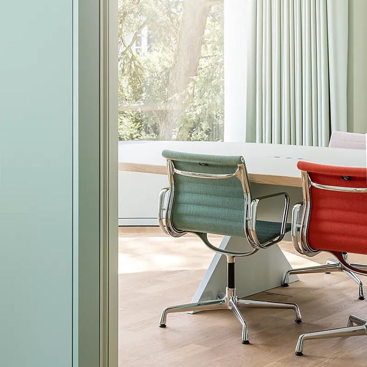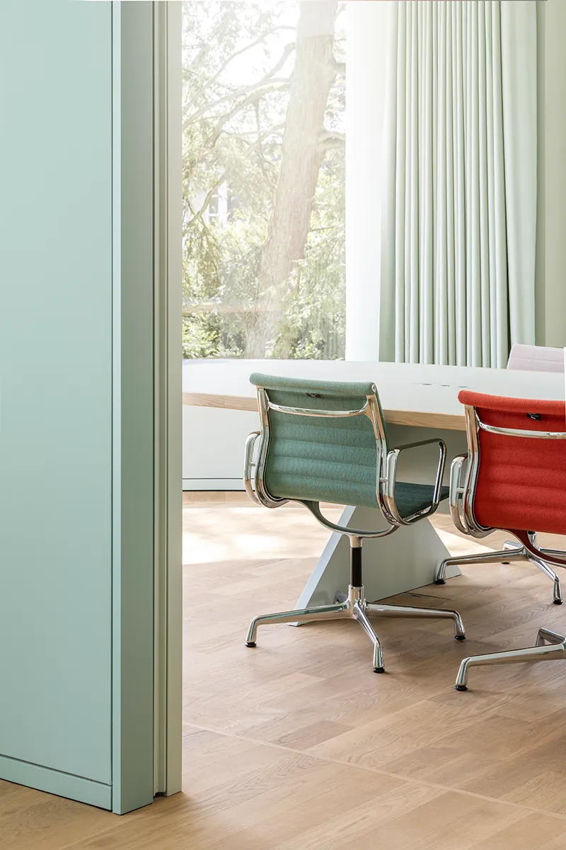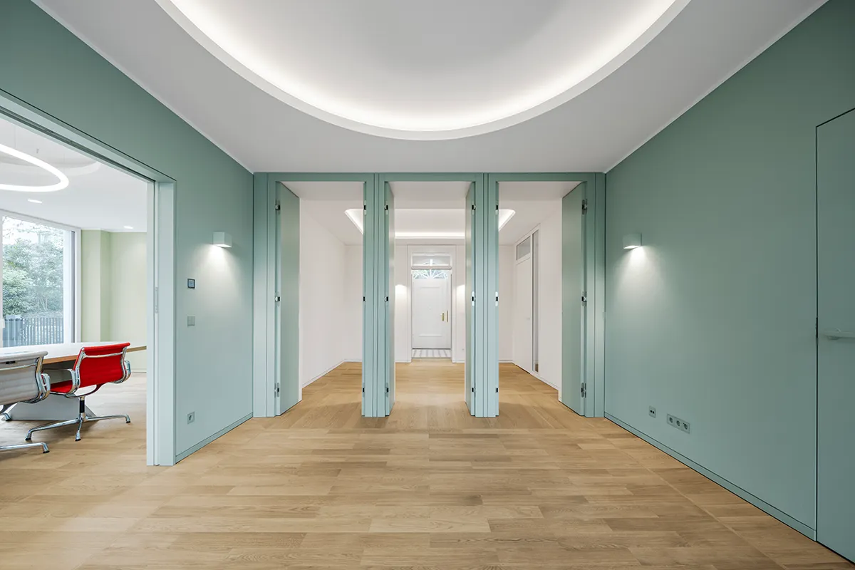 Im Rahmen der Sanierung wurde die Villa respektvoll für die zukünftige Nutzung umgebaut und größtenteils wieder in ihren historischen Originalzustand zurückversetzt. Veränderungen der letzten Jahrzehnte wurden rückgebaut und die ursprüngliche Fensteraufteilung erneut hergestellt. Durch die Hanglage konnte das ehemalige Kellergeschoss zum vollwertigen Stockwerk ausgebaut werden, in dem nun erstaunlich weitläufige Arbeitsräume angesiedelt sind. Die Innenarchitektur des Erdgeschosses wirkt mit hellen Holzböden, einem abgestimmten Farbkonzept und schlicht reduzierten Details sowie flächigen Möbeleinbauten zeitlos. Hier sind vor allem neue Empfangs- und Besprechungsräume angeordnet. Im Obergeschoss der Villa befinden sich weitere Büroräume, während im Dachgeschoss zwei Apartments angeordnet sind.