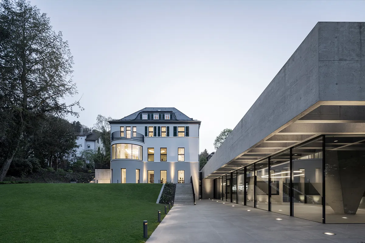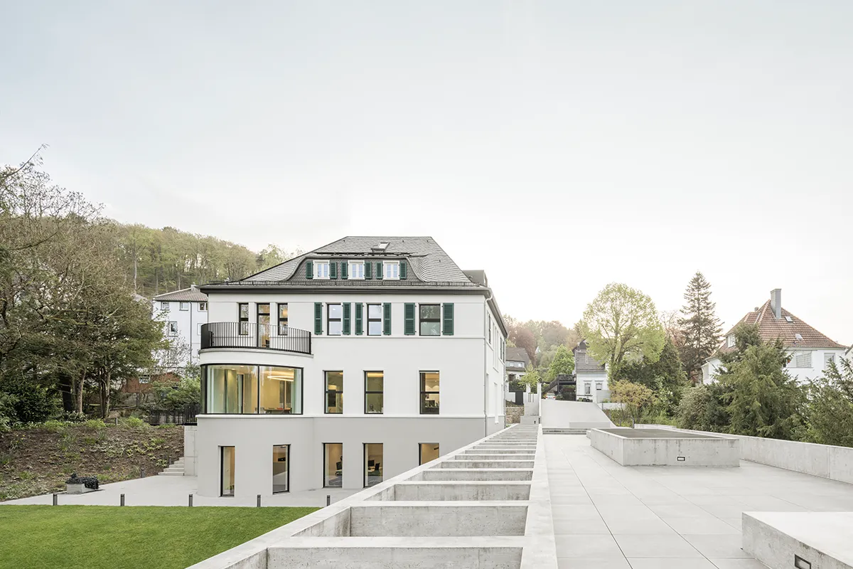 Das neue Gebäudekonzept von Philipp Nehse und Patrick Gerstein stärkt die Identität des Ortes, indem es die bestehende Villa freistellt und um einen modernen, in das Gelände eingebetteten Anbau ergänzt. Es werden neue Blickbezüge und Perspektiven generiert und die Gartenanlage aufgewertet. Die Gebäudetechnik des Ensembles setzt auf regenerative Energien, auf einen verantwortungsvollen Umgang mit Ressourcen und – anders als man es von einem Hersteller für Gebäudetechnik vermuten könnte – auf einen auf das Notwendige reduzierten Technikeinsatz.