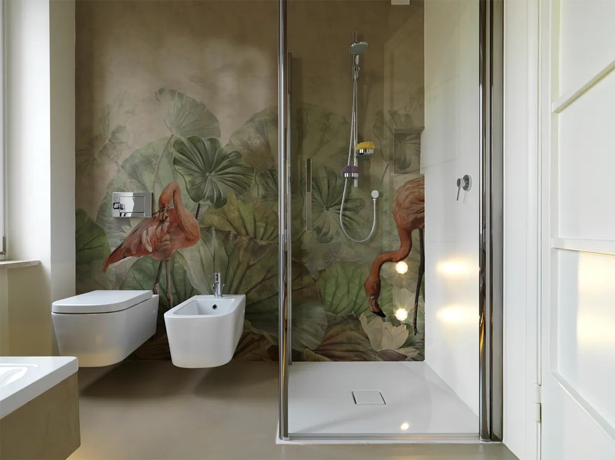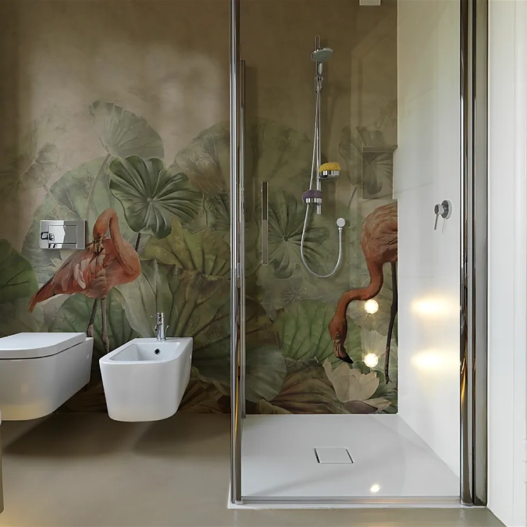 Die Glasfasertapete ist als "Alleskönner" strapazierfähig, belastbar und langlebig und eignet sich für stark frequentierte Räume und öffentliche Gebäude. Sie ist dank hochwertiger Versiegelung auch für Nassbereiche und Böden bestens geeignet. Dieses Material bringt vor allem bei der Badsanierung Vorteile mit sich, da es direkt auf vorhandene Fliesen aufgebracht werden kann und nur einen geringen zusätzlichen Platzbedarf hat. Auch in Neubädern bietet die Glasfasertapete neue gestalterische Möglichkeiten abseits traditioneller Lösungen.